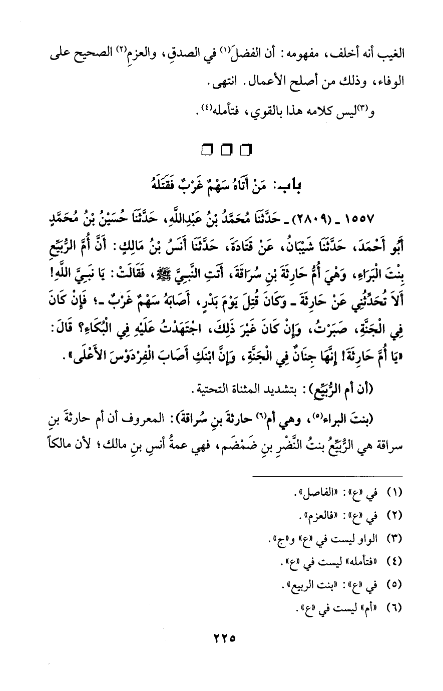 (بنتَ البراء (¬5)، وهي أم (¬6) حارثةَ بنِ سُراقةَ): المعروف أن أم حارثةَ بنِ سراقة هي الرُّبَيِّعُ بنتُ النَّضْرِ بنِ ضَمْضَم، فهي عمةُ أنسِ بنِ مالك؛ لأن مالكاً