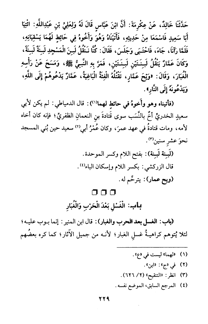 حَدَّثَنَا خَالِدٌ، عَنْ عِكْرِمَةَ: أَنَّ ابْنَ عَبَّاسٍ قَالَ لَهُ وَلعَلِيِّ بْنِ عَبْدِ اللهِ: ائْتِيَا أَبَا سَعِيدٍ فَاسْمَعَا مِنْ حَدِيثِهِ، فَأَتَيْنَاهُ وَهُوَ وَأَخُوهُ فِي حَائِطٍ لَهُمَا يَسْقِيَانِهِ، فَلَمَّا رَآناَ، جَاءَ، فَاحْتَبَى وَجَلَسَ، فَقَالَ: كُنَّا نَنْقُلُ لَبِنَ الْمَسْجدِ لَبِنَةً لَبِنَةً، وَكَانَ عَمَّارٌ يَنْقُلُ لَبِنَتَيْنِ لَبِنَتَيْنِ، فَمَرَّ بِهِ النَّبِيُّ - صلى الله عليه وسلم -، وَمَسَحَ عَنْ رَأْسِهِ الْغُبَارَ، وَقَالَ: "وَيْحَ عَمَّارٍ، تَقْتُلُهُ الْفِئَةُ الْبَاغِيَةُ، عَمَّارٌ يَدْعُوهُمْ إِلَى اللهِ، وَيَدْعُونَهُ إِلَى النَّارِ".