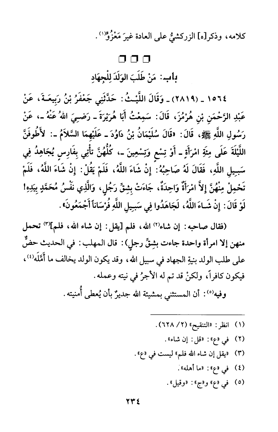 1564 - (2819) - وَقَالَ اللَّيْثُ: حَدَّثَنِي جَعْفَرُ بْنُ رَبِيعَةَ، عَنْ عَبْدِ الرَّحْمَنِ بْنِ هُرْمُزَ، قَالَ: سَمِعْتُ أَبَا هُرَيْرَةَ -رَضِيَ اللهُ عَنْهُ-، عَنْ رَسُولِ اللهِ - صلى الله عليه وسلم -، قَالَ: "قَالَ سُلَيْمَانُ بْنُ دَاوُدَ -عَلَيْهِمَا السَّلاَمُ-: لأَطُوفَنَّ اللَّيْلَةَ عَلَى مِئَةِ امْرَأَةٍ -أَوْ تِسْعٍ وَتِسْعِينَ-، كُلُّهُنَّ تأْتِي بِفَارِسٍ يُجَاهِدُ فِي سَبِيلِ اللهِ، فَقَالَ لَهُ صَاحِبُهُ: إِنْ شَاءَ اللهُ، فَلَمْ يَقُلْ: إِنْ شَاءَ اللهُ، فَلَمْ تَحْمِلْ مِنْهُنَّ إِلاَّ امْرَأَةٌ واحِدَةٌ، جَاءَتْ بِشِقِّ رَجُلٍ، وَالَّذِي نَفْسُ مُحَمَّدٍ بِيَدِهِ! لَوْ قَالَ: إِنْ شَاءَ اللهُ، لَجَاهَدُوا فِي سَبِيلِ اللهِ فُرْسَاناً أَجْمَعُونَ".