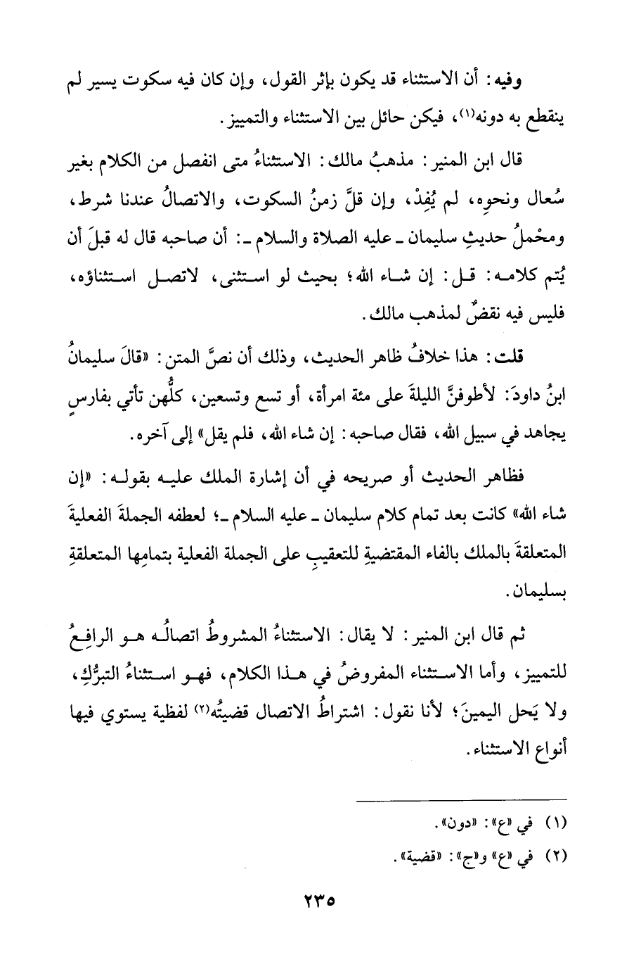 قال ابن المنير: مذهبُ مالك: الاستثناءُ متى انفصل من الكلام بغير سُعال ونحوِه، لم يُفِدْ، وإن قلَّ زمنُ السكوت، والاتصالُ عندنا شرط، ومحْملُ حديثِ سليمان -عليه الصلاة والسلام-: أن صاحبه قال له قبلَ أن يُتم كلامه: قل: إن شاء الله؛ بحيث لو استثنى، لاتصل استثناؤه، فليس فيه نقضٌ لمذهب مالك.