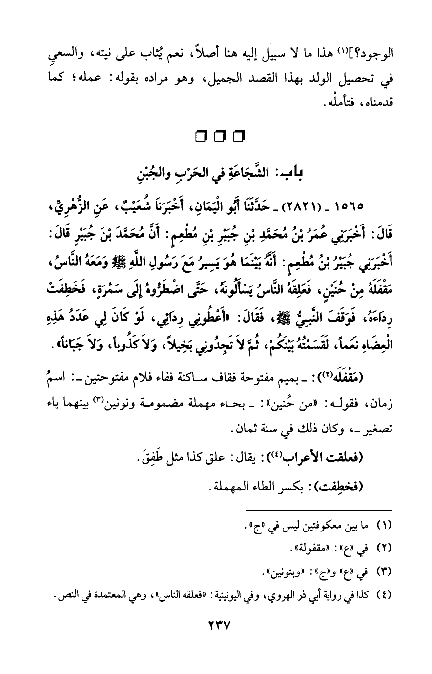 1565 - (2821) - حَدَّثَنَا أَبُو الْيَمَانِ، أَخْبَرَناَ شُعَيْبٌ، عَنِ الزُّهْرِيِّ، قَالَ: أَخْبَرَنِي عُمَرُ بْنُ مُحَمَّدِ بْنِ جُبَيْرِ بْنِ مُطْعِمٍ: أَنَّ مُحَمَّدَ بْنَ جُبَيْرٍ قَالَ: أَخْبَرَنِي جُبَيْرُ بْنُ مُطْعِمٍ: أَنَّهُ بَيْنَمَا هُوَ يَسِيرُ مَعَ رَسُولِ اللهِ - صلى الله عليه وسلم - وَمَعَهُ النَّاسُ، مَقْفَلَهُ مِنْ حُنَيْنٍ، فَعَلِقَهُ النَّاسُ يَسْأَلُونَهُ، حَتَّى اضْطَرُّوهُ إِلَى سَمُرَةٍ، فَخَطِفَتْ رِدَاءَهُ، فَوَقَفَ النَّبِيُّ - صلى الله عليه وسلم -، فَقَالَ: "أَعْطُونِي رِدَائِي، لَوْ كَانَ لِي عَدَدُ هَذِهِ الْعِضَاهِ نَعَماً، لَقَسَمْتُهُ بَيْنَكُمْ، ثُمَّ لاَ تَجِدُونِي بَخِيلاً، وَلاَ كَذُوباً، وَلاَ جَبَاناً".