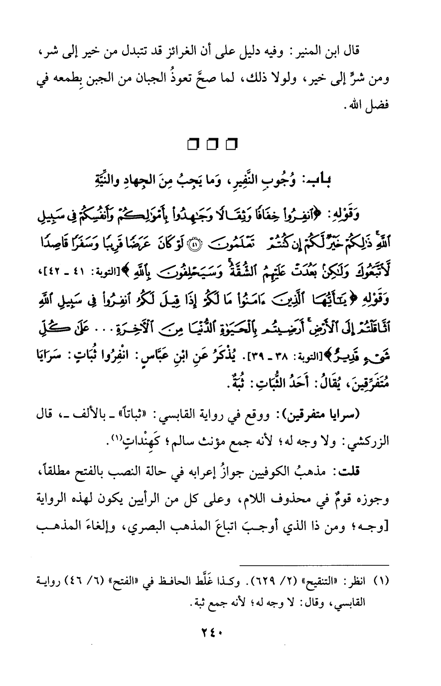 وَقَوْلِهِ: {انْفِرُوا خِفَافًا وَثِقَالًا وَجَاهِدُوا بِأَمْوَالِكُمْ وَأَنْفُسِكُمْ فِي سَبِيلِ اللَّهِ ذَلِكُمْ خَيْرٌ لَكُمْ إِنْ كُنْتُمْ تَعْلَمُونَ (41) لَوْ كَانَ عَرَضًا قَرِيبًا وَسَفَرًا قَاصِدًا لَاتَّبَعُوكَ وَلَكِنْ بَعُدَتْ عَلَيْهِمُ الشُّقَّةُ وَسَيَحْلِفُونَ بِاللَّهِ} [التوبة: 41 - 42]، وَقَوْلِهِ {يَاأَيُّهَا الَّذِينَ آمَنُوا مَا لَكُمْ إِذَا قِيلَ لَكُمُ انْفِرُوا فِي سَبِيلِ اللهِ اثَّاقَلْتُمْ إِلَى الْأَرْضِ أَرَضِيتُمْ بِالْحَيَاةِ الدُّنْيَا مِنَ الْآخِرَةِ. . . عَلَى كُلِّ شَيْءٍ قَدِيرٌ} [التوبة: 38 - 39]. يُذْكَرُ عَنِ ابْنِ عَبَّاسٍ: انْفِرُوا ثُبَاتٍ: سَرَايَا مُتَفَرِّقينَ، يُقَالُ: أَحَدُ الثُّبَاتِ: ثُبَةٌ.