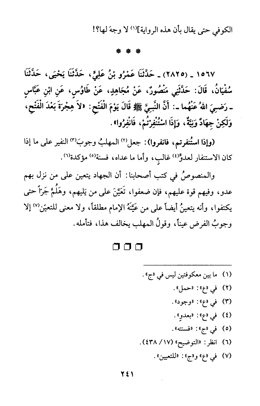1567 - (2825) - حَدَّثَنَا عَمْرُو بْنُ عَلِيٍّ، حَدَّثَنَا يَحْيَى، حَدَّثَنَا سُفْيَانُ، قَالَ: حَدَّثَنِي مَنْصُورٌ، عَنْ مُجَاهِدٍ، عَنْ طَاوُسٍ، عَنِ ابْنِ عَبَّاسٍ -رَضِيَ اللهُ عَنْهُما-: أَنَّ النَّبِيَّ - صلى الله عليه وسلم - قَالَ يَوْمَ الْفَتْحِ: "لاَ هِجْرَةَ بَعْدَ الْفَتْحِ، وَلَكِنْ جِهَادٌ وَنِيَّتةٌ، وَإِذَا اسْتُنْفِرْتُمْ، فَانْفِرُوا".