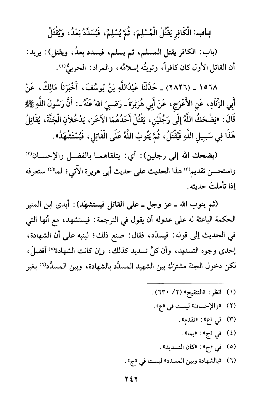 1568 - (2826) - حَدَّثَنَا عَبْدُ اللهِ بْنُ يُوسُفَ، أَخْبَرَناَ مَالِكٌ، عَنْ أَبِي الزِّناَدِ، عَنِ الأَعْرَجِ، عَنْ أَبِي هُرَيْرَةَ -رَضِيَ اللهُ عَنْهُ-: أَنَّ رَسُولَ اللهِ - صلى الله عليه وسلم - قَالَ: "يَضْحَكُ اللهُ إِلَى رَجُلَيْنِ، يَقْتُلُ أَحَدُهُمَا الآخَرَ، يَدْخُلاَنِ الْجَنَّةَ، يُقَاتِلُ هَذَا فِي سَبِيلِ اللهِ فَيُقْتَلُ، ثُمَّ يَتُوبُ اللهُ عَلَى الْقَاتِلِ، فَيُسْتَشْهَدُ".