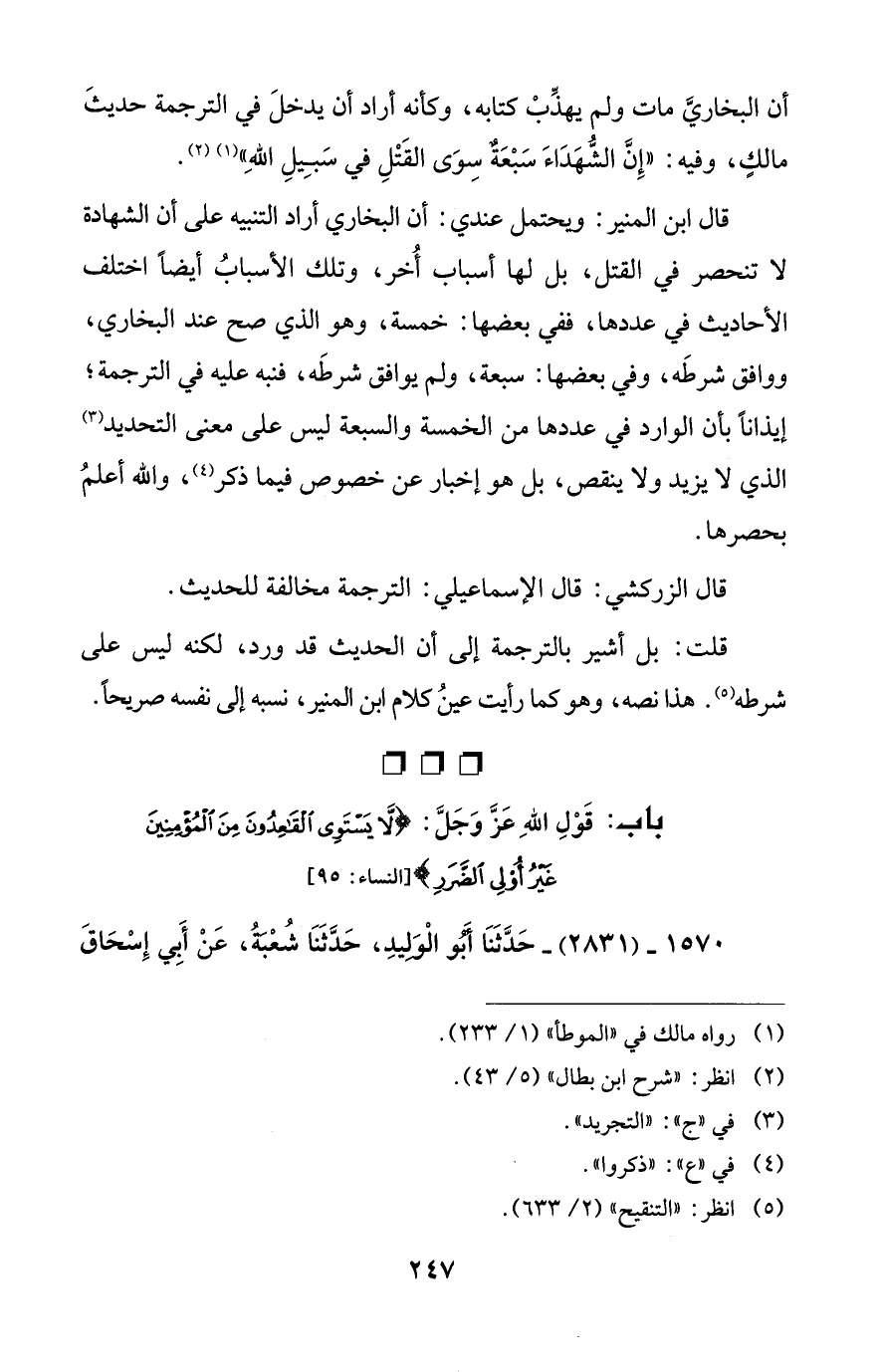 أن البخاريَّ مات ولم يهذِّبْ كتابه، وكأنه أراد أن يدخلَ في الترجمة حديثَ مالكٍ، وفيه: "إِنَّ الشُّهَدَاءَ سَبْعَةٌ سِوَى القَتْلِ في سَبِيلِ اللهِ" (¬1) (¬2).