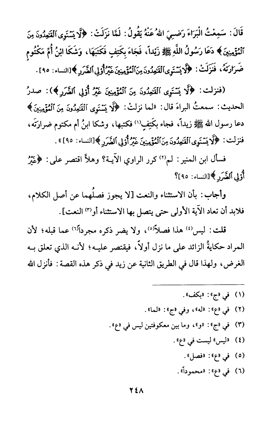 (فنزلت: {لَا يَسْتَوِي الْقَاعِدُونَ مِنَ الْمُؤْمِنِينَ غَيْرُ أُولِي الضَّرَرِ}: صدرُ الحديث: سمعتُ البراءَ قال: "لما نزلتْ: {لَا يَسْتَوِي الْقَاعِدُونَ مِنَ الْمُؤْمِنِينَ} دعا رسول الله - صلى الله عليه وسلم - زيداً، فجاء بكَتِفٍ (¬1) فكتبها، وشكا ابنُ أم مكتوم ضرارَتَه، فنزلت: {لَا يَسْتَوِي الْقَاعِدُونَ مِنَ الْمُؤْمِنِينَ غَيْرُ أُولِي الضَّرَرِ} [النساء: 95] ".