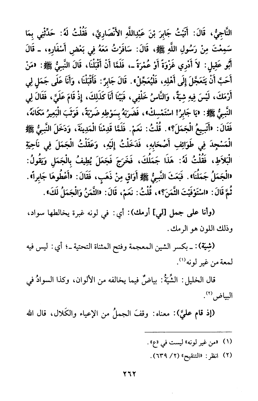 النَّاجِيُّ، قَالَ: أَتَيْتُ جَابِرَ بْنَ عَبْدِ اللهِ الأَنْصَارِيَّ، فَقُلْتُ لَهُ: حَدِّثْنِي بِمَا سَمِعْتَ مِنْ رَسُولِ اللهِ - صلى الله عليه وسلم -، قَالَ: سَافَرْتُ مَعَهُ فِي بَعْضِ أَسْفَارِهِ، -قَالَ أَبُو عَقِيلٍ: لاَ أَدْرِي غَزْوَةً أَوْ عُمْرَةً-، فَلَمَّا أَنْ أَقْبَلْنَا، قَالَ النَّبِيُّ - صلى الله عليه وسلم -: "مَنْ أَحَبَّ أَنْ يَتَعَجَّلَ إِلَى أَهْلِهِ، فَلْيُعَجِّلْ". قَالَ جَابِرٌ: فَأَقْبَلْنَا، وَأَناَ عَلَى جَمَلٍ لِي أَرْمَكَ، لَيْسَ فِيهِ شِيَهٌ، وَالنَّاسُ خَلْفِي، فَبَيْنَا أَناَ كَذَلِكَ، إِذْ قَامَ عَلَيَّ، فَقَالَ لِي النَّبِيُّ - صلى الله عليه وسلم -: "يَا جَابِرُ! اسْتَمْسِكْ"، فَضَرَبَهُ بِسَوْطِهِ ضَرْبَهً، فَوَثَبَ الْبَعِيرُ مَكَانَهُ، فَقَالَ: "أَتَبِيعُ الْجَمَلَ؟ ". قُلْتُ: نَعَمْ. فَلَمَّا قَدِمْنَا الْمَدِينَةَ، وَدَخَلَ النَّبِيُّ - صلى الله عليه وسلم - الْمَسْجِدَ فِي طَوَائِفِ أَصْحَابِهِ، فَدَخَلْتُ إِلَيْهِ، وَعَقَلْتُ الْجَمَلَ فِي ناَحِيَةِ الْبَلاَطِ، فَقُلْتُ لَهُ: هَذَا جَمَلُكَ، فَخَرَجَ فَجَعَلَ يُطِيفُ بِالْجَمَلِ وَيَقُولُ: "الْجَمَلُ جَمَلُنَا". فَبَعَثَ النَّبِيُّ - صلى الله عليه وسلم - أَوَاقٍ مِنْ ذَهَبٍ، فَقَالَ: "أَعْطُوهَا جَابِراً". ثُمَّ قَالَ: "اسْتَوْفَيْتَ الثَّمَنَ؟ "، قُلْتُ: نَعَمْ، قَالَ: "الثَّمَنُ وَالْجَمَلُ لَكَ".