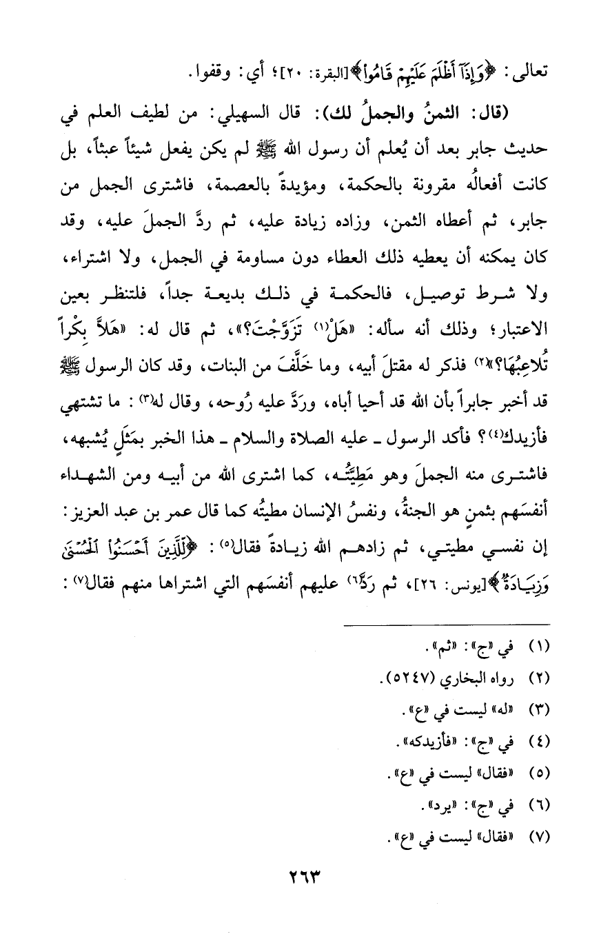 (قال: الثمنُ والجملُ لك): قال السهيلي: من لطيف العلم في حديث جابر بعد أن يُعلم أن رسول الله - صلى الله عليه وسلم - لم يكن يفعل شيئاً عبثاً، بل كانت أفعالُه مقرونة بالحكمة، ومؤيدةً بالعصمة، فاشترى الجمل من جابر، ثم أعطاه الثمن، وزاده زيادة عليه، ثم ردَّ الجملَ عليه، وقد كان يمكنه أن يعطيه ذلك العطاء دون مساومة في الجمل، ولا اشتراء، ولا شرط توصيل، فالحكمة في ذلك بديعة جداً، فلتنظر بعين الاعتبار؛ وذلك أنه سأله: "هَلْ (¬1) تَزَوَّجْتَ؟ "، ثم قال له: "هَلاَّ بِكْراً تُلاعِبُهَا؟ " (¬2) فذكر له مقتلَ أبيه، وما خَلَّفَ من البنات، وقد كان الرسول - صلى الله عليه وسلم - قد أخبر جابراً بأن الله قد أحيا أباه، ورَدَّ عليه رُوحه، وقال له (¬3): ما تشتهي فأزيدك (¬4)؟ فأكد الرسول -عليه الصلاة والسلام- هذا الخبر بمَثَلٍ يُشبهه، فاشترى منه الجملَ وهو مَطِيَّتُه، كما اشترى الله من أبيه ومن الشهداء أنفسَهم بثمنٍ هو الجنةُ، ونفسُ الإنسان مطيتُه كما قال عمر بن عبد العزيز: إن نفسي مطيتي، ثم زادهم الله زيادةً فقال (¬5): {لِلَّذِينَ أَحْسَنُوا الْحُسْنَى وَزِيَادَةٌ} [يونس: 26]، ثم رَدَّ (¬6) عليهم أنفسَهم التي اشتراها منهم فقال (¬7):