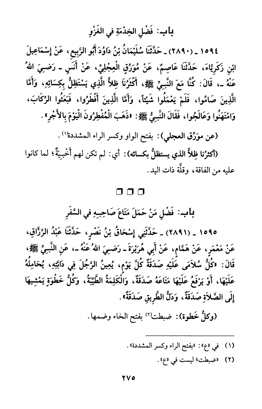 1595 - (2891) - حَدَّثَنِي إِسْحَاقُ بْنُ نَصْرٍ، حَدَّثَنَا عَبْدُ الرَّزِّاقِ، عَنْ مَعْمَرٍ، عَنْ هَمَّامٍ، عَنْ أَبِي هُرَيْرَةَ -رَضِيَ اللهُ عَنْهُ-، عَنِ النَّبِيِّ - صلى الله عليه وسلم -، قَالَ: "كُلُّ سُلاَمَى عَلَيْهِ صَدَقَةٌ كُلَّ يَوْمٍ، يُعِينُ الرَّجُلَ فِي دَابَّتِهِ، يُحَامِلُهُ عَلَيْهَا، أَوْ يَرْفَعُ عَلَيْهَا مَتَاعَهُ صَدَقَةٌ، وَالْكَلِمَةُ الطَّيِّبَةُ، وَكُلُّ خَطْوَةٍ يَمْشِيهَا إِلَى الصَّلاَةِ صَدَقَةٌ، وَدَلُّ الطَّرِيقِ صَدَقَةٌ".