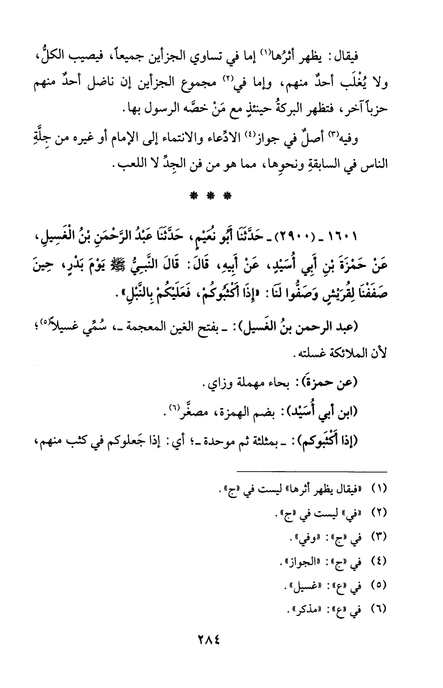 1601 - (2900) - حَدَّثَنَا أَبو نُعَيْمٍ، حَدَّثَنَا عَبْدُ الرَّحْمَنِ بْنُ الْغَسِيلِ، عَنْ حَمْزَةَ بْنِ أَبِي أُسَيْدٍ، عَنْ أَبِيهِ، قَالَ: قَالَ النَّبِيُّ - صلى الله عليه وسلم - يَوْمَ بَدْرٍ، حِينَ صَفَفْنَا لِقُرَيْشٍ وَصَفُّوا لَنَا: "إِذَا أَكْثَبُوكُمْ، فَعَلَيْكُمْ بِالنَّبْلِ".
