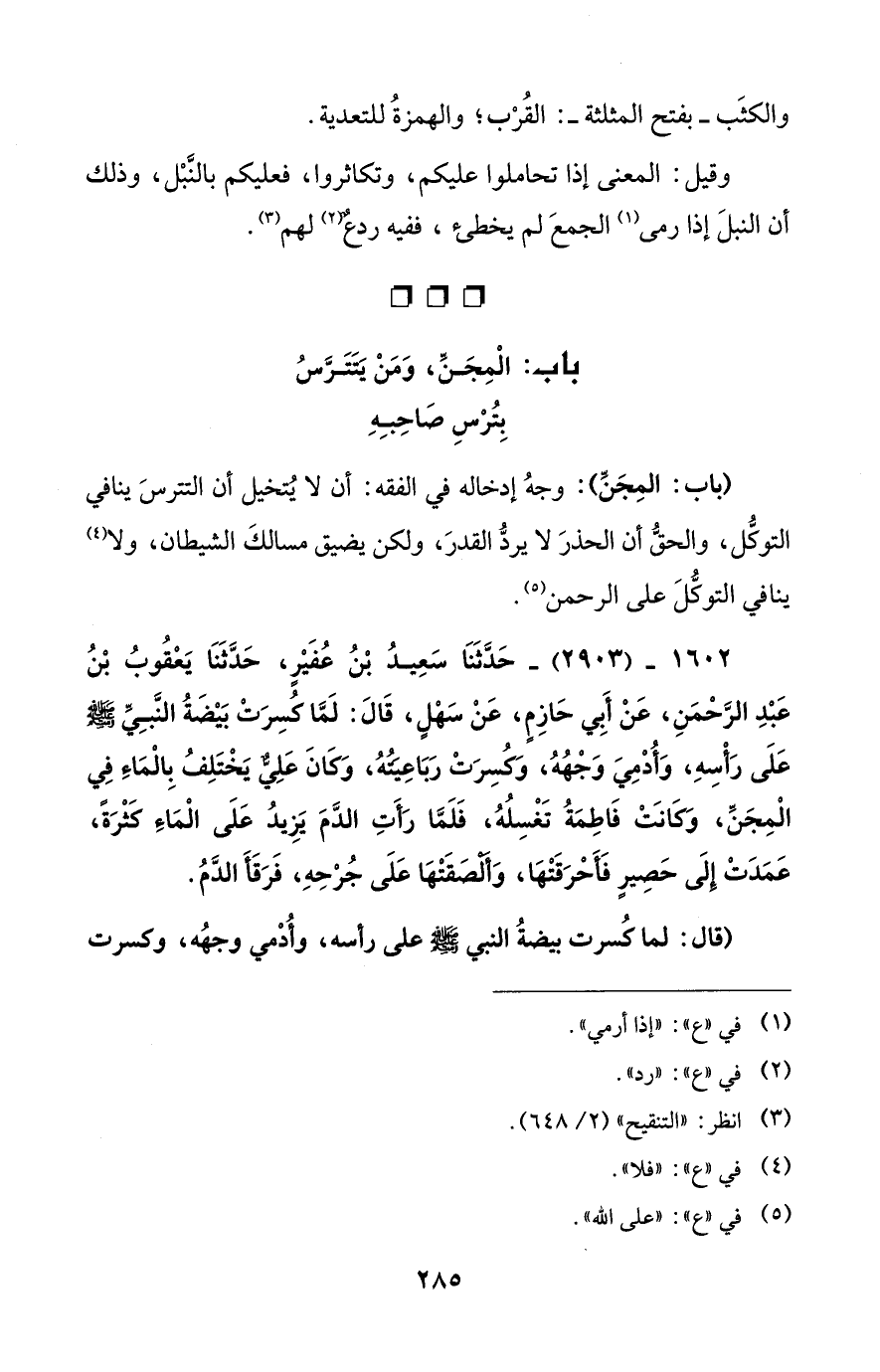 1602 - (2903) - حَدَّثَنَا سَعِيدُ بْنُ عُفَيْرٍ، حَدَّثَنَا يَعْقُوبُ بْنُ عَبْدِ الرَّحْمَنِ، عَنْ أَبِي حَازِمٍ، عَنْ سَهْلٍ، قَالَ: لَمَّا كُسِرَتْ بَيْضَةُ النَّبِيِّ - صلى الله عليه وسلم - عَلَى رَأْسِهِ، وَأُدْمِيَ وَجْهُهُ، وَكُسِرَتْ رَبَاعِيتَهُ، وَكَانَ عَلِيٌّ يَخْتَلِفُ بِالْمَاءِ فِي الْمِجَنِّ، وَكَانَتْ فَاطِمَةُ تَغْسِلُهُ، فَلَمَّا رَأَتِ الدَّمَ يَزِيدُ عَلَى الْمَاءِ كَثْرَةً، عَمَدَتْ إِلَى حَصِيرٍ فَأَحْرَقَتْهَا، وَألصَقَتْهَا عَلَى جُرْحِهِ، فَرَقَأَ الدَّمُ.