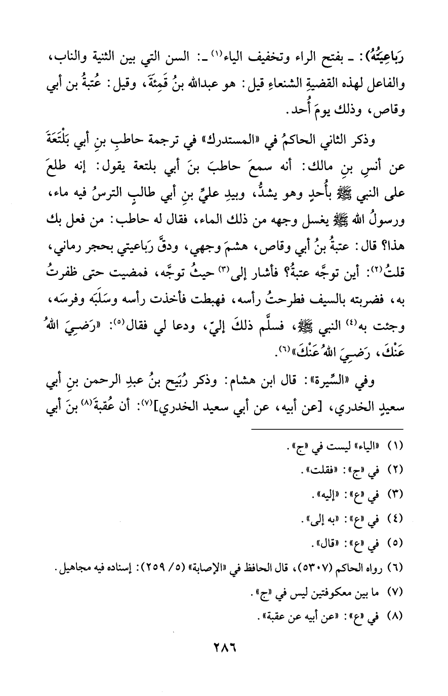 وذكر الثاني الحاكمُ في "المستدرك" في ترجمة حاطبِ بنِ أبي بَلْتَعَةَ عن أنسِ بنِ مالك: أنه سمعَ حاطبَ بنَ أبي بلتعة يقول: إنه طلعَ على النبي - صلى الله عليه وسلم - بأُحدٍ وهو يشدُّ، وبيدِ عليِّ بنِ أبي طالب الترسُ فيه ماء، ورسولُ الله - صلى الله عليه وسلم - يغسل وجهه من ذلك الماء، فقال له حاطب: من فعل بك هذا؟ قال: عتبةُ بنُ أبي وقاص، هشمَ وجهي، ودقَّ رَباعيتي بحجر رماني، قلتُ (¬2): أين توجَّه عتبةُ؟ فأشار إلى (¬3) حيثُ توجَّه، فمضيت حتى ظفرتُ به، فضربته بالسيف فطرحتُ رأسه، فهبطت فأخذت رأسه وسَلَبَه وفرسَه، وجئت به (¬4) النبي - صلى الله عليه وسلم -، فسلَّم ذلكَ إليّ، ودعا لي فقال (¬5): "رَضِيَ اللهُ عَنْكَ، رَضِيَ اللهُ عَنْكَ" (¬6).