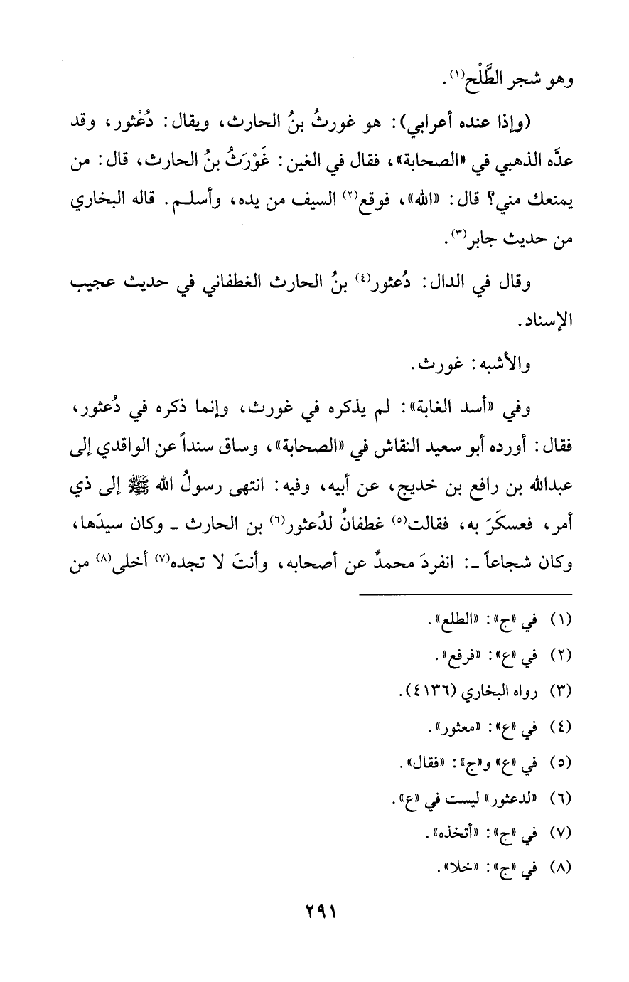 وفي "أسد الغابة": لم يذكره في غورث، وإنما ذكره في دُعثور، فقال: أورده أبو سعيد النقاش في "الصحابة"، وساق سنداً عن الواقدي إلى عبد الله بن رافع بن خديج، عن أبيه، وفيه: انتهى رسولُ الله - صلى الله عليه وسلم - إلى ذي أمر، فعسكَرَ به، فقالت (¬5) غطفانُ لدُعثور (¬6) بن الحارث -وكان سيدَها، وكان شجاعاً-: انفردَ محمدٌ عن أصحابه، وأنتَ لا تجده (¬7) أخلى (¬8) من