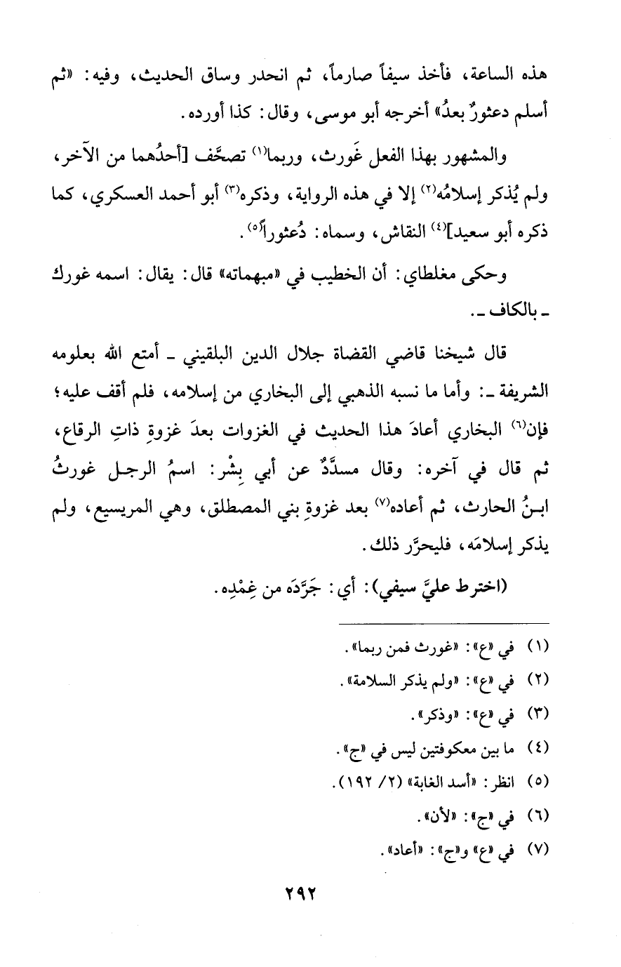 قال شيخنا قاضي القضاة جلال الدين البلقيني -أمتع الله بعلومه الشريفة-: وأما ما نسبه الذهبي إلى البخاري من إسلامه، فلم أقف عليه؛ فإن (¬6) البخاري أعادَ هذا الحديث في الغزوات بعدَ غزوةِ ذاتِ الرقاع، ثم قال في آخره: وقال مسدَّدٌ عن أبي بِشْر: اسمُ الرجل غورثُ ابنُ الحارث، ثم أعاده (¬7) بعد غزوةِ بني المصطلق، وهي المريسيع، ولم يذكر إسلامَه، فليحرَّر ذلك.
