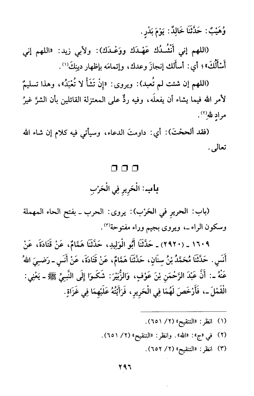 1609 - (2920) - حَدَّثَنَا أَبُو الْوَلِيدِ، حَدَّثَنَا هَمَّامٌ، عَنْ قَتَادَةَ، عَنْ أَنَسٍ. حَدَّثَنَا مُحَمَّدُ بْنُ سِنَانٍ، حَدَّثَنَا هَمَّامٌ، عَنْ قَتَادَةَ، عَنْ أَنَسٍ -رَضِيَ اللهُ عَنْهُ-: أَنَّ عَبْدَ الرَّحْمَنِ بْنَ عَوْفٍ، وَالزُّبَيْرَ: شَكَوَا إِلَى النَّبِيِّ - صلى الله عليه وسلم -يَعْنِي: الْقَمْلَ-، فَأَرْخَصَ لَهُمَا فِي الْحَرِيرِ، فَرَأَيْتُهُ عَلَيْهِمَا فِي غَزَاةٍ.