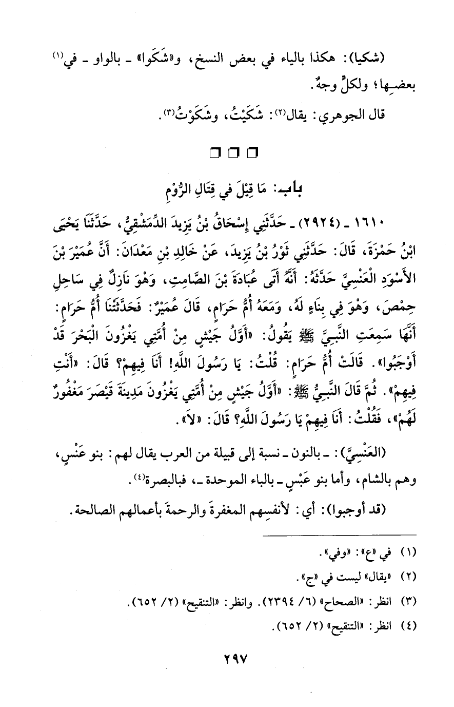 1610 - (2924) - حَدَّثَنِي إِسْحَاقُ بْنُ يَزِيدَ الدِّمَشْقِيُّ، حَدَّثَنَا يَحْيىَ ابْنُ حَمْزَةَ، قَالَ: حَدَّثَنِي ثَوْرُ بْنُ يَزِيدَ، عَنْ خَالِدِ بْنِ مَعْدَانَ: أَنَّ عُمَيْرَ بْنَ الأَسْوَدِ الْعَنْسِيَّ حَدَّثَهُ: أَنَّهُ أَتَى عُبَادَةَ بْنَ الصَّامِتِ، وَهْوَ ناَزِلٌ فِي سَاحِلِ حِمْصَ، وَهْوَ فِي بِنَاءٍ لَهُ، وَمَعَهُ أُمُّ حَرَامٍ، قَالَ عُمَيْرٌ: فَحَدَّثَتْنَا أُمُّ حَرَامٍ: أَنَّهَا سَمِعَتِ النَّبِيَّ - صلى الله عليه وسلم - يَقُولُ: "أَوَّلُ جَيْشٍ مِنْ أُمَّتِي يَغْزُونَ الْبَحْرَ قدْ أَوْجَبُوا". قَالَتْ أُمُّ حَرَامٍ: قُلْتُ: يَا رَسُولَ اللهِ! أَناَ فِيهِمْ؟ قَالَ: "أَنْتِ فِيهِمْ". ثُمَّ قَالَ النَّبِيُّ - صلى الله عليه وسلم -: "أَوَّلُ جَيْشٍ مِنْ أُمَّتِي يَغْزُونَ مَدِينَةَ قَيْصَرَ مَغْفُورٌ لَهُمْ"، فَقُلْتُ: أَناَ فِيهِمْ يَا رَسُولَ اللهِ؟ قَالَ: "لاَ".