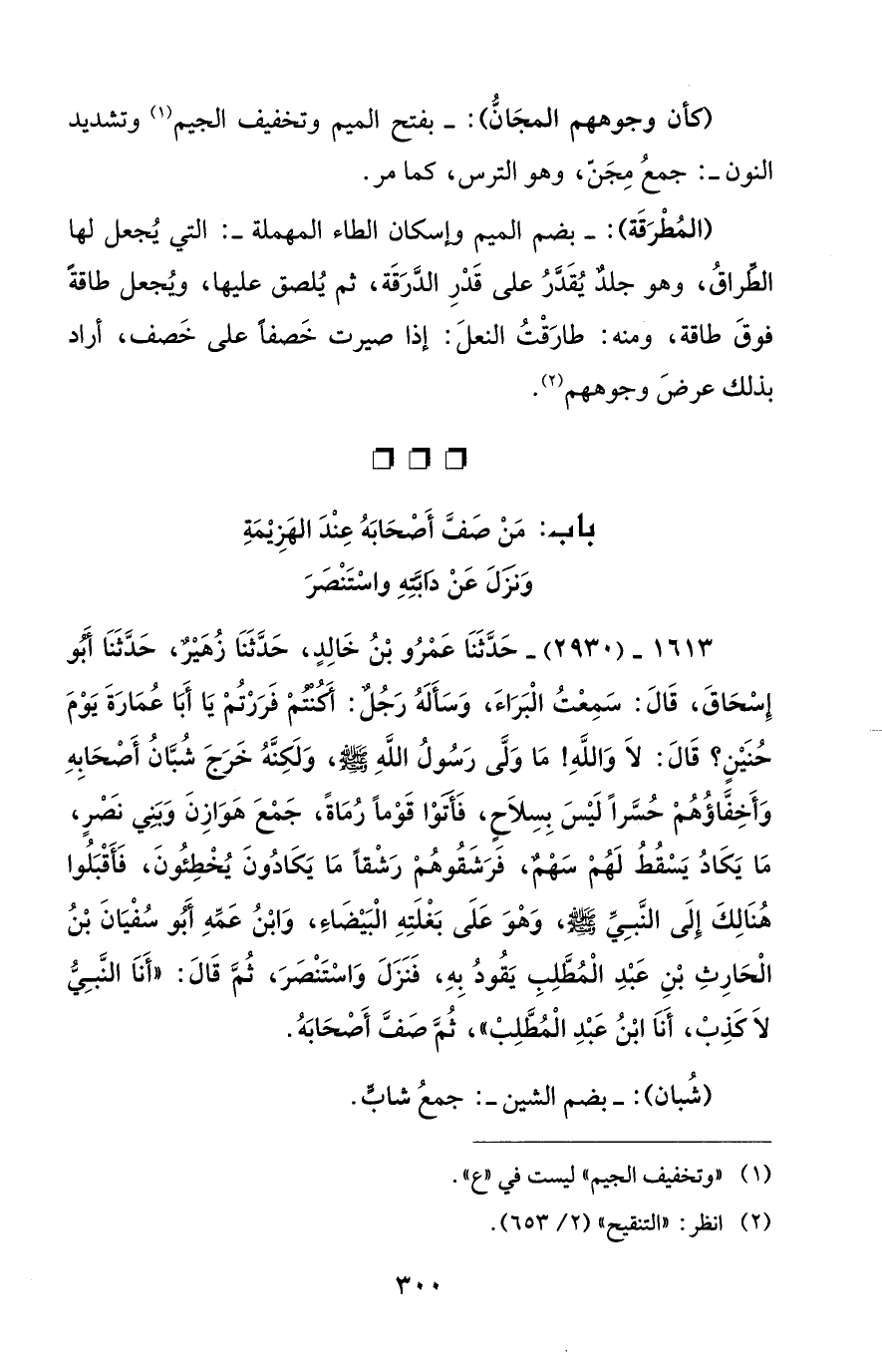 1613 - (2930) - حَدَّثَنَا عَمْرُو بْنُ خَالِدٍ، حَدَّثَنَا زُهَيْرٌ، حَدَّثَنَا أَبُو إِسْحَاقَ، قَالَ: سَمِعْتُ الْبَرَاءَ، وَسَأَلَهُ رَجُل: أَكُنْتُمْ فَرَرْتُمْ يَا أَبَا عُمَارَةَ يَوْمَ حُنَيْنٍ؟ قَالَ: لاَ وَاللهِ! مَا وَلَّى رَسُولُ اللهِ - صلى الله عليه وسلم -، وَلَكِنَّهُ خَرَجَ شُبَّانُ أَصْحَابِهِ وَأَخِفَّاؤُهُمْ حُسَّراً لَيْسَ بِسِلاَحِ، فَأَتَوْا قَوْماً رُمَاةً، جَمْعَ هَوَازِنَ وَبَنِي نَصْرٍ، مَا يَكَادُ يَسْقُطُ لَهُمْ سَهْمٌ، فَرَشَقُوهُمْ رَشْقاً مَا يَكَادُونَ يُخْطِئُونَ، فَأَقْبَلُوا هُنَالِكَ إِلَى النَّبِيِّ - صلى الله عليه وسلم -، وَهْوَ عَلَى بَغْلَتِهِ الْبَيْضَاءِ، وَابْنُ عَمِّهِ أَبُو سُفْيَانَ بْنُ الْحَارِثِ بْنِ عَبْدِ الْمُطَّلِبِ يَقُودُ بِهِ، فَنَزَلَ وَاسْتَنْصَرَ، ثُمَّ قَالَ: "أَناَ النَّبِيُّ لاَ كَذِبْ، أَناَ ابْنُ عَبْدِ الْمُطَّلِبْ"، ثُمَّ صَفَّ أَصْحَابَهُ.