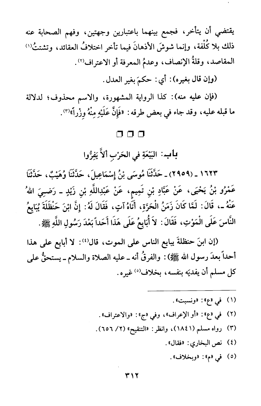 1623 - (2959) - حَدَّثَنَا مُوسَى بْنُ إِسْمَاعِيلَ، حَدَّثَنَا وُهَيْبٌ، حَدَّثَنَا عَمْرُو بْنُ يَحْيَى، عَنْ عَبَّادِ بْنِ تَمِيمٍ، عَنْ عَبْدِ اللهِ بْنِ زَيْدٍ -رَضِيَ اللهُ عَنْهُ-، قَالَ: لَمَّا كَانَ زَمَنُ الْحَرَّةِ، أَتَاهُ آتٍ، فَقَالَ لَهُ: إِنَّ ابْنَ حَنْظَلَةَ يُبَايعُ النَّاسَ عَلَى الْمَوْتِ، فَقَالَ: لاَ أُبَايعُ عَلَى هَذَا أَحَداً بَعْدَ رَسُولِ اللهِ - صلى الله عليه وسلم -.