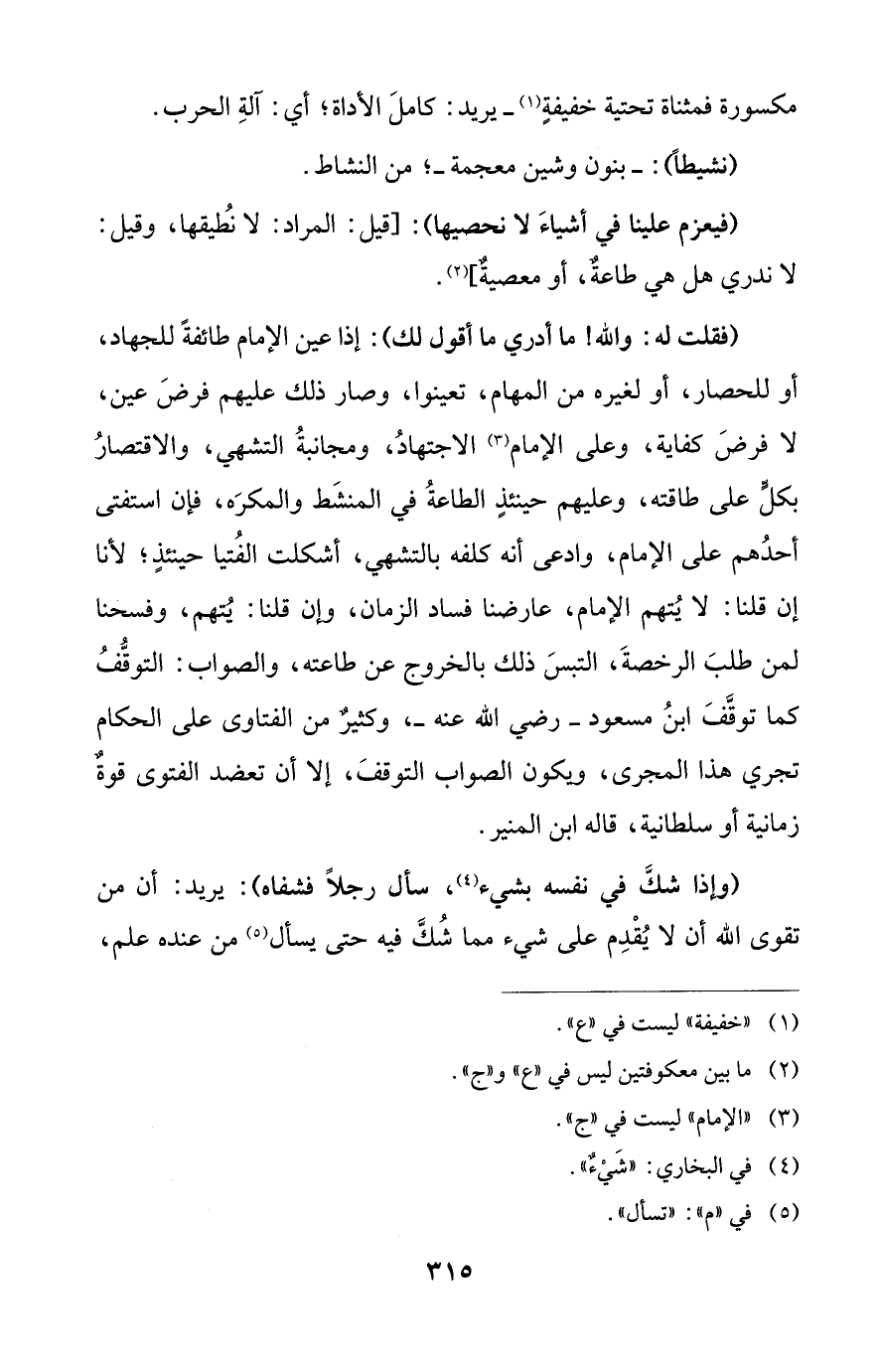 (فقلت له: والله! ما أدري ما أقول لك): إذا عين الإمام طائفةً للجهاد، أو للحصار، أو لغيره من المهام، تعينوا، وصار ذلك عليهم فرضَ عين، لا فرضَ كفاية، وعلى الإمام (¬3) الاجتهادُ، ومجانبةُ التشهي، والاقتصارُ بكلٍّ على طاقته، وعليهم حينئذٍ الطاعةُ في المنشَط والمكرَه، فإن استفتى أحدُهم على الإمام، وادعى أنه كلفه بالتشهي، أشكلت الفُتيا حينئذٍ؛ لأنا إن قلنا: لا يُهم الإمام، عارضنا فساد الزمان، وإن قلنا: يُتهم، وفسحنا لمن طلبَ الرخصةَ، التبسَ ذلك بالخروج عن طاعته، والصواب: التوقُّفُ كما توقَّفَ ابنُ مسعود -رضي الله عنه-، وكثيرٌ من الفتاوى على الحكام تجري هذا المجرى، ويكون الصواب التوقفَ، إلا أن تعضد الفتوى قوةٌ زمانية أو سلطانية، قاله ابن المنير.