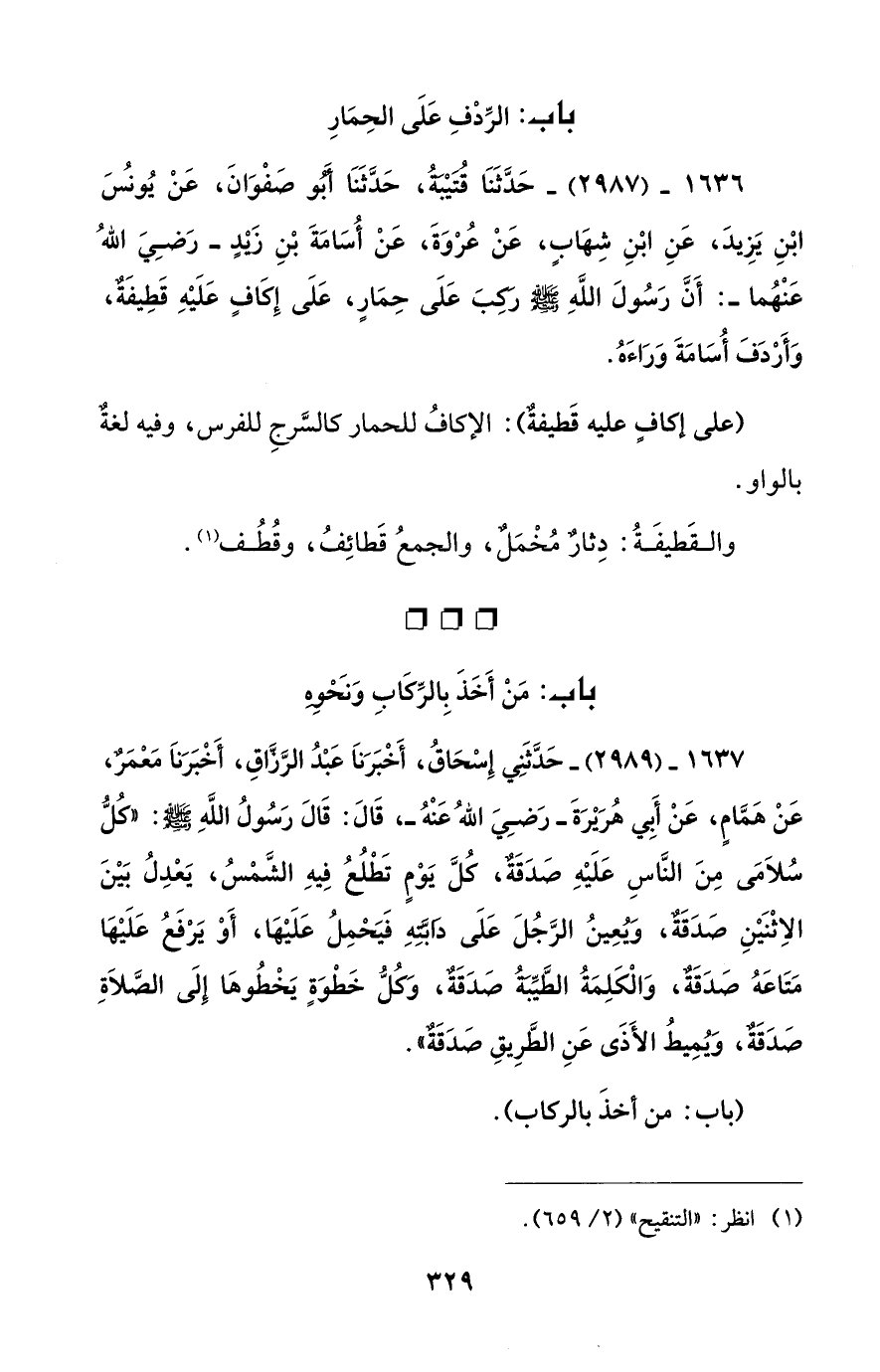 1636 - (2987) - حَدَّثَنَا قَتَيْبَةُ، حَدَّثَنَا أَبُو صَفْوَانَ، عَنْ يُونُسَ ابْنِ يَزِيدَ، عَنِ ابْنِ شِهَابٍ، عَنْ عُرْوَةَ، عَنْ أُسَامَةَ بْنِ زَيْدٍ -رَضِيَ اللهُ عَنْهُما-: أَنَّ رَسُولَ اللهِ - صلى الله عليه وسلم - رَكِبَ عَلَى حِمَارٍ، عَلَى إِكَافٍ عَلَيْهِ قَطِيفَةٌ، وَأَرْدَفَ أُسَامَةَ وَرَاءَهُ.
