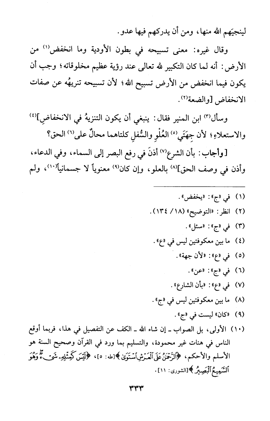 (¬10) الأولى، بل الصواب -إن شاء الله- الكف عن التفصيل في هذا، فربما أوقع الناس في هنات غير محمودة، والتسليم بما ورد في القرآن وصحيح السنة هو الأسلم والأحكم، {الرَّحْمَنُ عَلَى الْعَرْشِ اسْتَوَى} [طه: 5]، {لَيْسَ كَمِثْلِهِ شَيْءٌ وَهُوَ السَّمِيعُ الْبَصِيرُ} [الشورى:11].