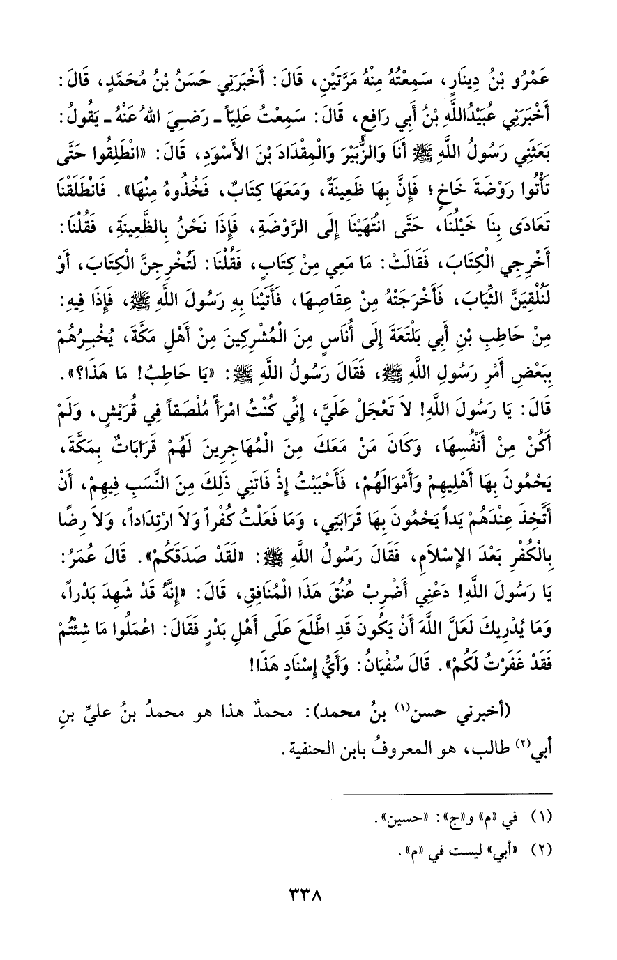عَمْرُو بْنُ دِينَارٍ، سَمِعْتُهُ مِنْهُ مَرَّتَيْنِ، قَالَ: أَخْبَرَنِي حَسَنُ بْنُ مُحَمَّدٍ، قَالَ: أَخْبَرَنِي عُبَيْدُ اللهِ بْنُ أَبِي رَافِع، قَالَ: سَمِعْتُ عَلِيّاً -رَضِيَ اللهُ عَنْهُ- يَقُولُ: بَعَثَنِي رَسُولُ اللهِ - صلى الله عليه وسلم - أَناَ وَالزُّبَيْرَ وَالْمِقْدَادَ بْنَ الأَسْوَدِ، قَالَ: "انْطَلِقُوا حَتَّى تَأْتُوا رَوْضَةَ خَاخٍ؛ فَإِنَّ بِهَا ظَعِينَةً، وَمَعَهَا كِتَابٌ، فَخُذُوهُ مِنْهَا". فَانْطَلَقْنَا تَعَادَى بِنَا خَيْلُنَا، حَتَى انتُهَيْنَا إِلَى الرَّوْضَةِ، فَإِذَا نَحْنُ بِالظَّعِينَةِ، فَقُلْنَا: أَخْرِجِي الْكِتَابَ، فَقَالَتْ: مَا مَعِي مِنْ كتَابٍ، فَقُلْنَا: لَتُخْرِجِنَّ الْكِتَابَ، أوْ لَنْلْقِيَنَّ الثِّيَابَ، فَأَخْرَجَتْهُ مِنْ عِقَاصِهَا، فَأَتَيْنَا بِهِ رَسُولَ اللهِ - صلى الله عليه وسلم -، فَإِذَا فِيهِ: مِنْ حَاطِبِ بْنِ أَبِي بَلْتَعَةَ إِلَى أُناَسٍ مِنَ الْمُشْرِكِينَ مِنْ أَهْلِ مَكَّةَ، يُخْبِرُهُمْ بِبَعْضِ أَمْرِ رَسُولِ اللهِ - صلى الله عليه وسلم -، فَقَالَ رَسُولُ اللهِ - صلى الله عليه وسلم -: "يَا حَاطِبُ! مَا هَذَا؟ ". قَالَ: يَا رَسُولَ اللهِ! لاَ تَعْجَلْ عَلَيَّ، إِنِّي كُنْتُ امْرَأً مُلْصَقاً فِي قُرَيْشٍ، وَلَمْ أَكَنْ مِنْ أَنْفُسِهَا، وَكَانَ مَنْ مَعَكَ مِنَ الْمُهَاجِرِينَ لَهُمْ قَرَابَاتٌ بِمَكَّةَ، يَحْمُونَ بِهَا أَهْلِيهِمْ وَأَمْوَالَهُمْ، فَأَحْبَبْتُ إِذْ فَاتَنِي ذَلِكَ مِنَ النَّسَبِ فِيهِمْ، أَنْ أَتَّخِذَ عِنْدَهُمْ يَداً يَحْمُونَ بِهَا قَرَابَتِي، وَمَا فَعَلْتُ كُفْراً وَلاَ ارْتِدَاداً، وَلاَ رِضاً بِالْكُفْرِ بَعْدَ الإِسْلاَمِ، فَقَالَ رَسُولُ اللهِ - صلى الله عليه وسلم -: "لَقَدْ صَدَقَكُمْ". قَالَ عُمَرُ: يَا رَسُولَ اللهِ! دَعْنِي أَضْرِبْ عُنُقَ هَذَا الْمُنَافِقِ، قَالَ: "إِنَّهُ قَدْ شَهِدَ بَدْراً، وَمَا يُدْرِيكَ لَعَلَّ اللهَ أَنْ يَكُونَ قَدِ اطَّلَعَ عَلَى أَهْلِ بَدْرٍ فَقَالَ: اعْمَلُوا مَا شِئْتُمْ فَقَدْ غَفَرْتُ لَكُمْ". قَالَ سُفْيَانُ: وَأَيُّ إِسْنَادٍ هَذَا!