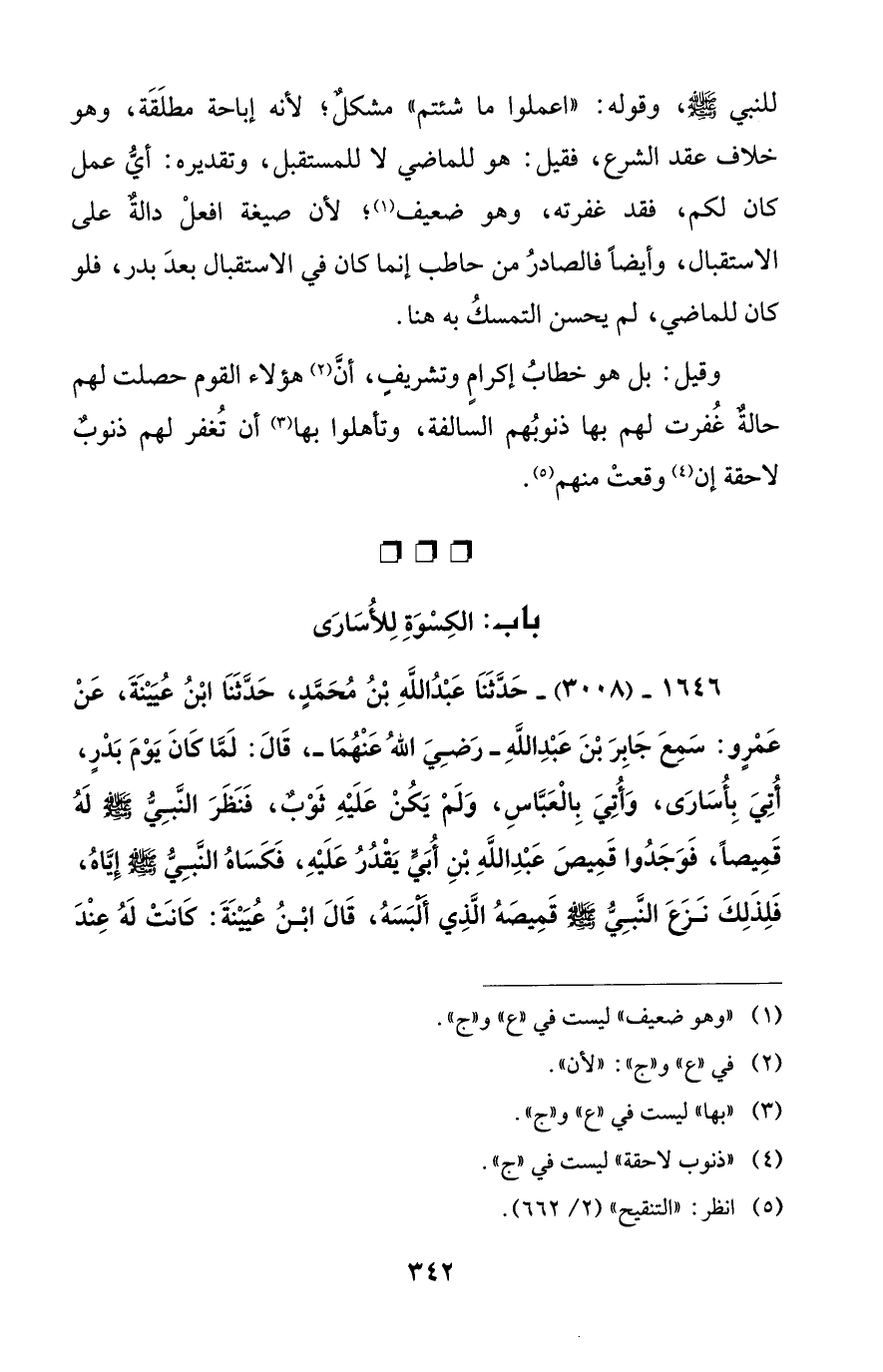 1646 - (3008) - حَدَّثَنَا عَبْدُ اللهِ بْنُ مُحَمَّدٍ، حَدَّثَنَا ابْنُ عُيَيْنَةَ، عَنْ عَمْرٍو: سَمِعَ جَابِرَ بْنَ عَبْدِ اللهِ -رَضِيَ اللهُ عَنْهُمَا-، قَالَ: لَمَّا كَانَ يَوْمَ بَدْرٍ، أُتِيَ بِأُسَارَى، وَأُتِيَ بِالْعَبَّاسِ، وَلَمْ يَكُنْ عَلَيْهِ ثَوْبٌ، فَنَظَرَ النَّبِيُّ - صلى الله عليه وسلم - لَهُ قَمِيصاً، فَوَجَدُوا قَمِيصَ عَبْدِ اللهِ بْنِ أُبَيٍّ يَقْدُرُ عَلَيْهِ، فَكَسَاهُ النَّبِيُّ - صلى الله عليه وسلم - إِيَّاهُ، فَلِذَلِكَ نَزَعَ النَّبِيُّ - صلى الله عليه وسلم - قَمِيصَهُ الَّذِي أَلْبَسَهُ، قَالَ ابْنُ عُيَيْنَةَ: كَانَتْ لَهُ عِنْدَ