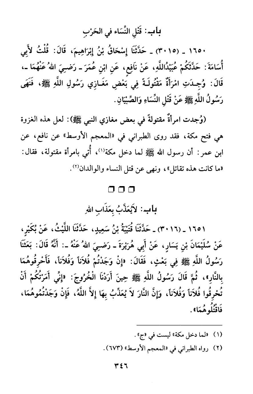 1650 - (3015) - حَدَّثَنَا إِسْحَاقُ بْنُ إِبْرَاهِيمَ، قَالَ: قُلْتُ لأَبِي أُسَامَةَ: حَدَّثَكُمْ عُبَيْدُ اللهِ، عَنْ ناَفِعٍ، عَنِ ابْنِ عُمَرَ -رَضِيَ اللهُ عَنْهُمَا-، قَالَ: وُجِدَتِ امْرَأةٌ مَقْتُولَةً فِي بَعْضِ مَغَازِي رَسُولِ اللهِ - صلى الله عليه وسلم -، فَنَهَى رَسُولُ اللهِ - صلى الله عليه وسلم - عَنْ قَتْلِ النِّسَاءَ وَالصِّبْيَانِ.