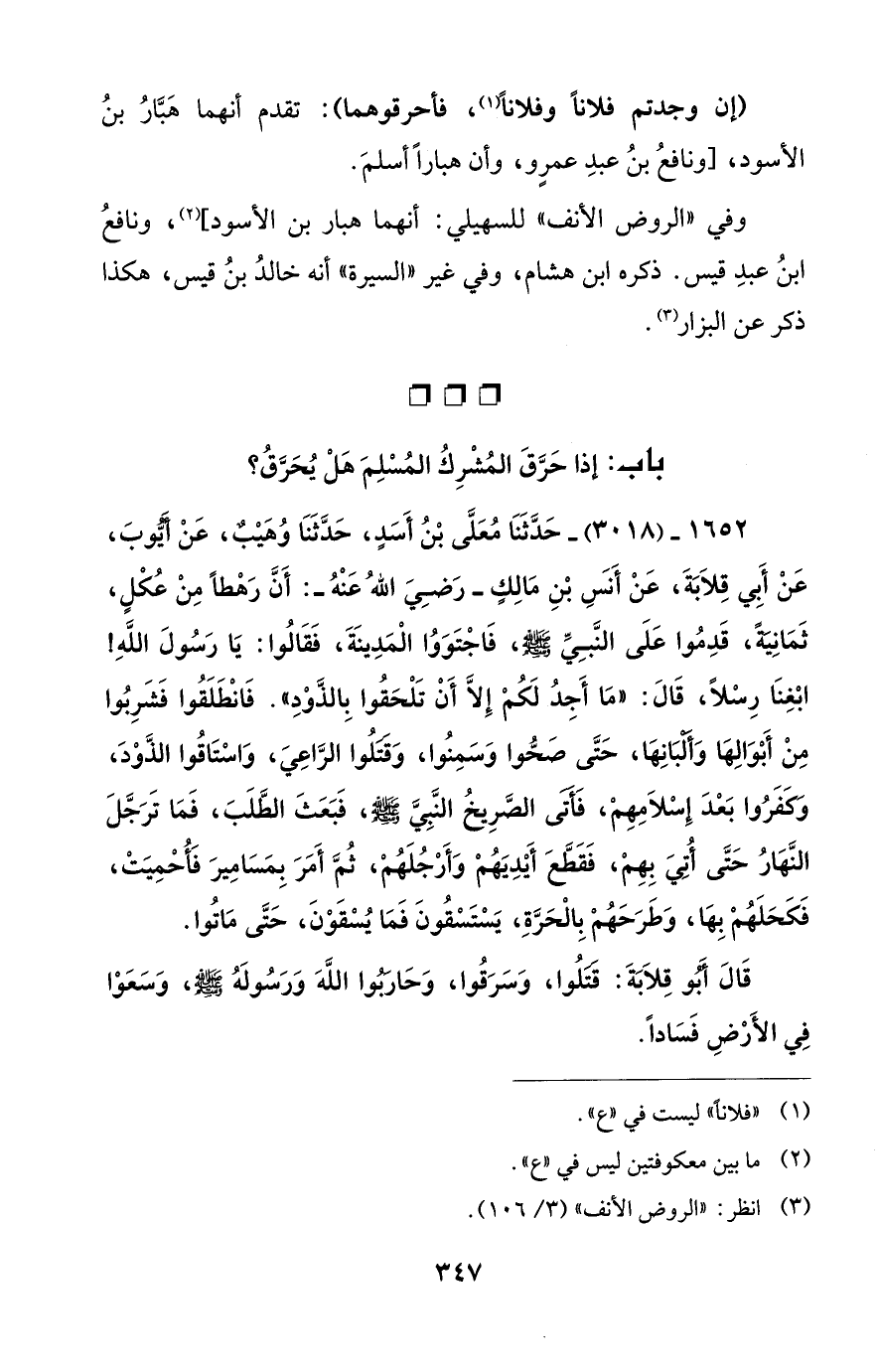 1652 - (3018) - حَدَّثَنَا مُعَلَّى بْنُ أَسَدٍ، حَدَّثَنَا وُهَيْبٌ، عَنْ أَيُوبَ، عَنْ أَبِي قِلاَبَةَ، عَنْ أَنَسِ بْنِ مَالِكٍ -رَضِيَ اللهُ عَنْهُ-: أَنَّ رَهْطاً مِنْ عُكْلٍ، ثَمَانِيَةً، قَدِمُوا عَلَى النَّبِيِّ - صلى الله عليه وسلم -، فَاجْتَوَوُا الْمَدِينَةَ، فَقَالُوا: يَا رَسُولَ اللهِ! ابْغِنَا رِسْلاً، قَالَ: "مَا أَجِدُ لَكُمْ إِلاَّ أَنْ تَلْحَقُوا بِالذَّوْدِ". فَانْطَلَقُوا فَشَرِبُوا مِنْ أَبْوَالِهَا وَأَلْبَانِهَا، حَتَّى صَحُّوا وَسَمِنُوا، وَقَتَلُوا الرَّاعِيَ، وَاسْتَاقُوا الذَّوْدَ، وَكَفَرُوا بَعْدَ إِسْلاَمِهِمْ، فَأَتَى الصَّرِيخُ النَّبِيَّ - صلى الله عليه وسلم -، فَبَعَثَ الطَّلَبَ، فَمَا تَرَجَّلَ النَّهَارُ حَتَّى أُتِيَ بِهِمْ، فَقَطَّعَ أَيْدِيَهُمْ وَأَرْجُلَهُمْ، ثُمَّ أَمَرَ بِمَسَامِيرَ فَأُحْمِيَتْ، فَكَحَلَهُمْ بِهَا، وَطَرَحَهُمْ بِالْحَرَّةِ، يَسْتَسْقُونَ فَمَا يُسْقَوْنَ، حَتَّى مَاتُوا.