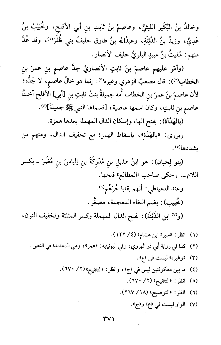 (وأمّر عليهم عاصمَ بنَ ثابتٍ الأنصاريَّ جدَّ عاصم بنِ عمرَ بنِ الخطاب (¬2)): قال مصعبٌ الزهري وغيره (¬3): إنما هو خالُ عاصمٍ، لا جَدُّه؛ لأن عاصمَ بنَ عمرَ بنِ الخطاب أُمه جميلةُ بنتُ ثابتِ بنِ [أبي] الأفلح أختُ عاصمِ بنِ ثابتٍ، وكان اسمها عاصية، [فسماها النبي - صلى الله عليه وسلم - جميلةَ] (¬4).