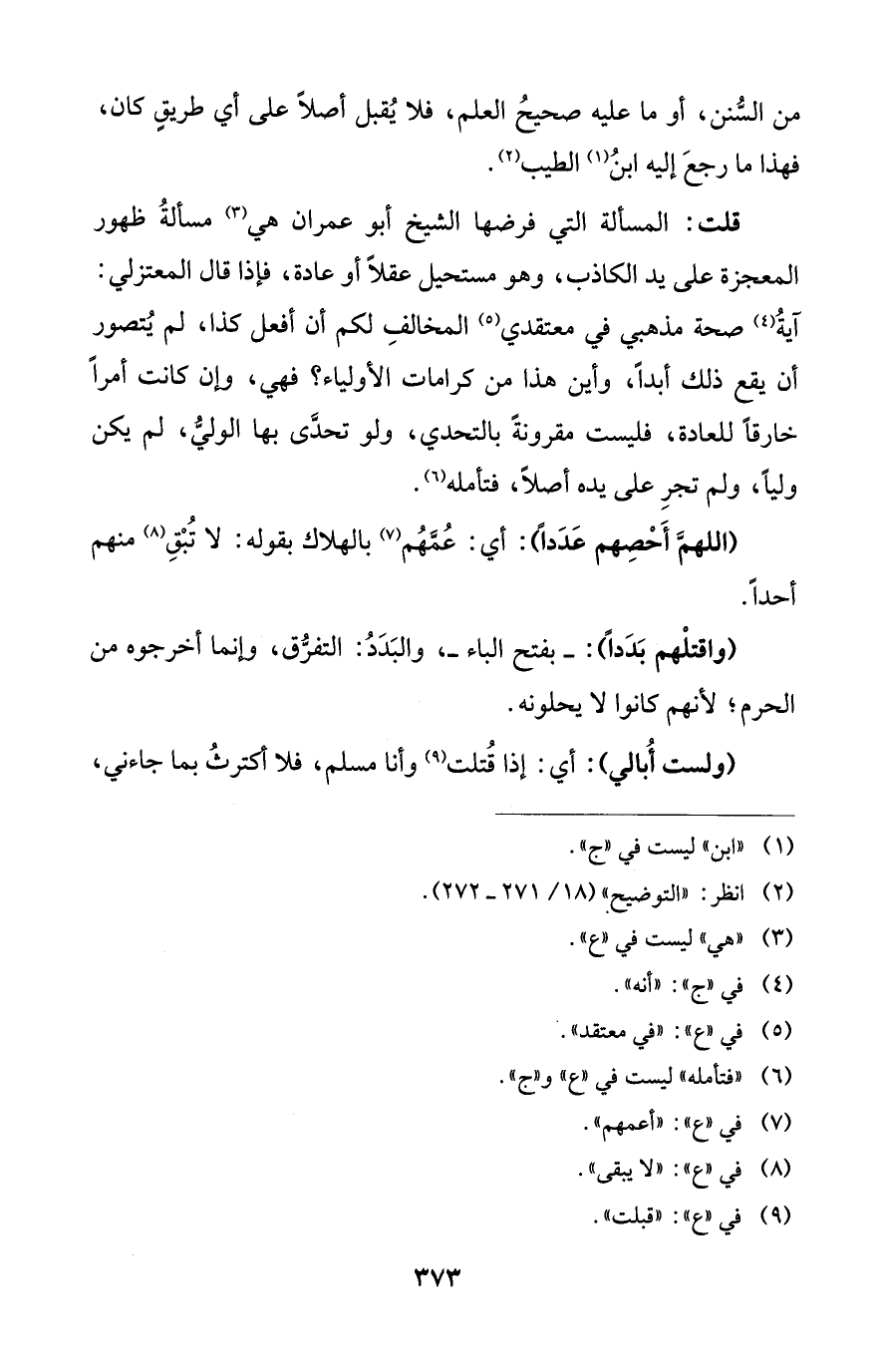 قلت: المسألة التي فرضها الشيخ أبو عمران هي (¬3) مسألةُ ظهور المعجزة على يد الكاذب، وهو مستحيل عقلاً أو عادة، فإذا قال المعتزلي: آيةُ (¬4) صحة مذهبي في معتقدي (¬5) المخالفِ لكم أن أفعل كذا، لم يُتصور أن يقع ذلك أبداً، وأين هذا من كرامات الأولياء؟ فهي، وإن كانت أمراً خارقاً للعادة، فليست مقرونةً بالتحدي، ولو تحدَّى بها الوليُّ، لم يكن ولياً، ولم تجرِ على يده أصلاً، فتأمله (¬6).