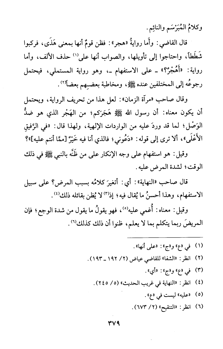 وقال صاحب "مرآة الزمان": لعل هذا من تحريف الرواية، ويحتمل أن يكون معناه: أن رسول الله - صلى الله عليه وسلم - هَجَرَكم؛ من الهَجْر الذي هو ضدُّ الوَصْل؛ لما قد وردَ عليه من الواردات الإلهية، ولهذا قال: "في الرَّفيقِ الأَعْلَى"، ألا ترى إلى قوله: "دَعُوني؛ فالذي أنا فيه خَيْرٌ [ممَّا أنتم عليه] "؟
