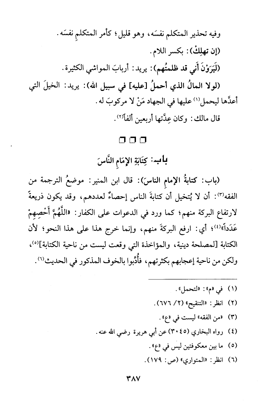 (باب: كتابةُ الإمامِ الناسَ): قال ابن المنير: موضعُ الترجمة من الفقه (¬3): أن لا يُتخيل أن كتابةَ الناس إحصاءٌ لعددهم، وقد يكون ذريعةً لارتفاع البركة منهم؛ كما ورد في الدعوات على الكفار: "اللَّهُمَّ أَحْصِهِمْ عَدَداً" (¬4)؛ أي: ارفع البركةَ منهم، وإنما خرج هذا على هذا النحو؛ لأن الكتابة [لمصلحة دينية، والمؤاخذة التي وقعت ليست من ناحية الكتابة] (¬5)، ولكن من ناحية إعجابهم بكثرتهم، فأُدِّبوا بالخوف المذكور في الحديث (¬6).