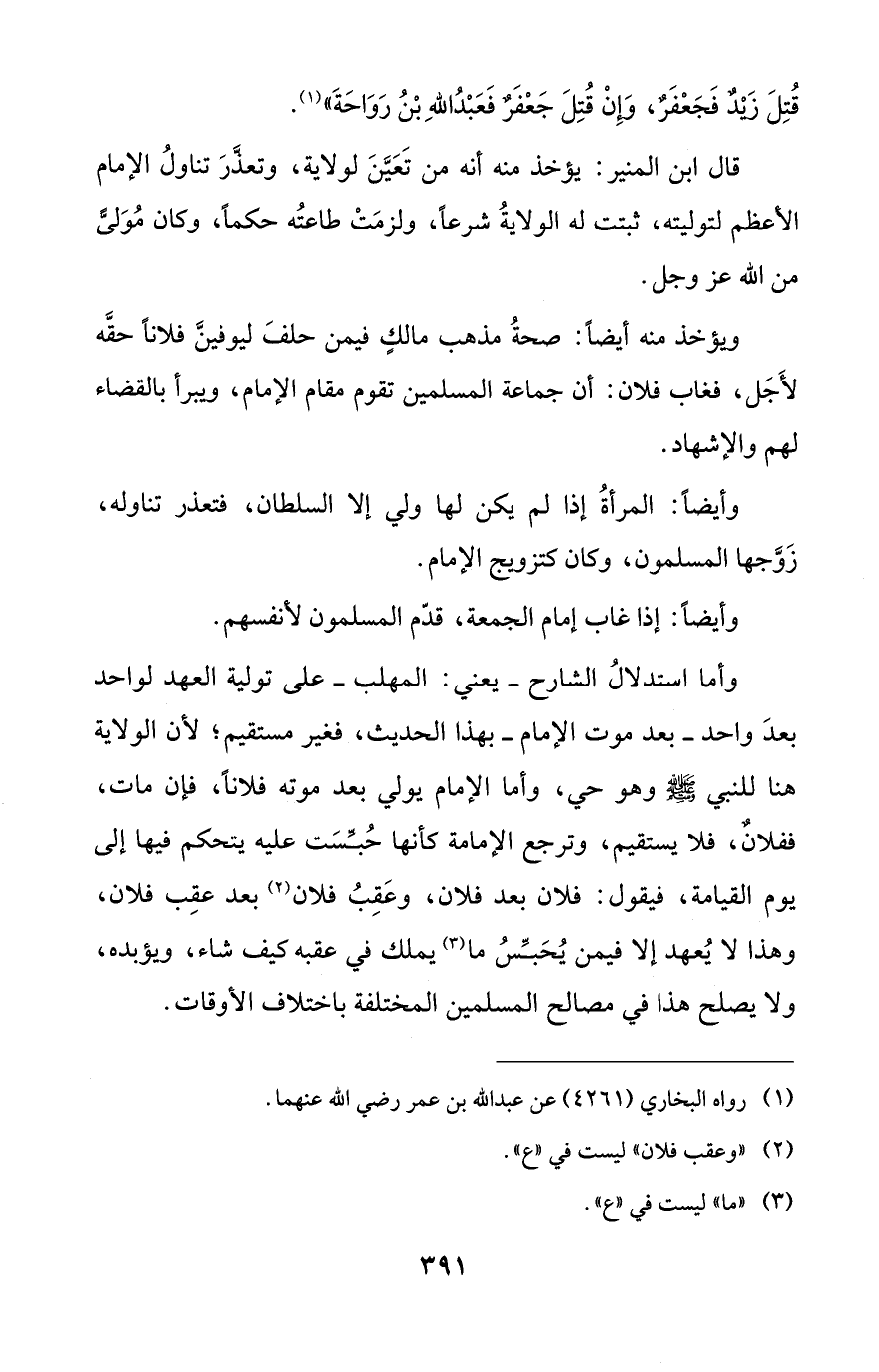 وأما استدلالُ الشارح -يعني: المهلب- على تولية العهد لواحد بعدَ واحد -بعد موت الإمام- بهذا الحديث، فغير مستقيم؛ لأن الولاية هنا للنبي - صلى الله عليه وسلم - وهو حي، وأما الإمام يولي بعد موته فلاناً، فإن مات، ففلانٌ، فلا يستقيم، وترجع الإمامة كأنها حُبِّسَت عليه يتحكم فيها إلى يوم القيامة، فيقول: فلان بعد فلان، وعَقِبُ فلان (¬2) بعد عقِب فلان، وهذا لا يُعهد إلا فيمن يُحَبِّسُ ما (¬3) يملك في عقبه كيف شاء، ويؤبده، ولا يصلح هذا في مصالح المسلمين المختلفة باختلاف الأوقات.