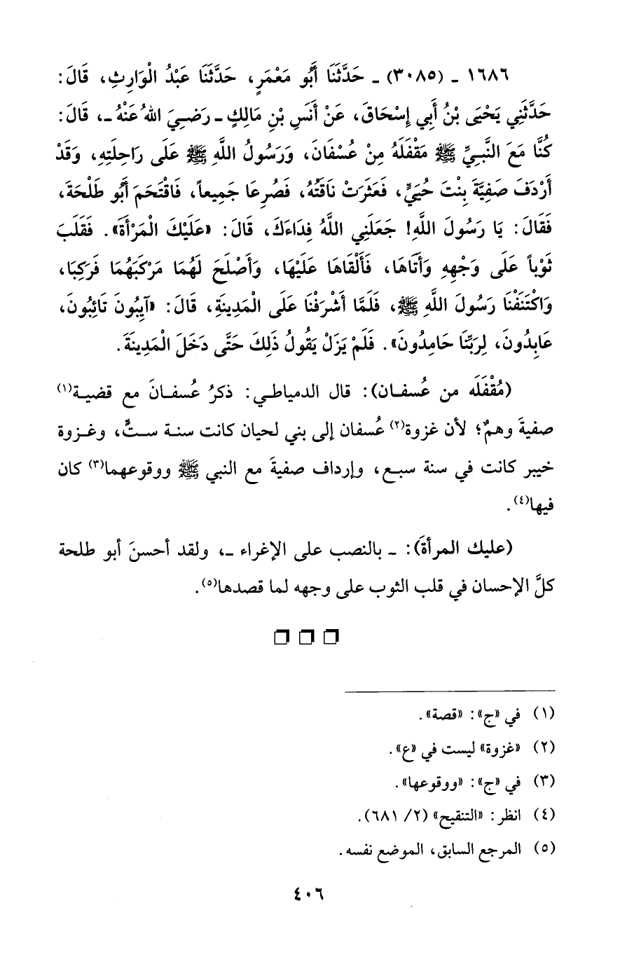 1686 - (3085) - حَدَّثَنَا أَبُو مَعْمَرٍ، حَدَّثَنَا عَبْدُ الْوَارِثِ، قَالَ: حَدَّثَنِي يَحْيىَ بْنُ أَبِي إِسْحَاقَ، عَنْ أَنَسِ بْنِ مَالِكٍ -رَضِيَ اللهُ عَنْهُ-، قَالَ: كُنَّا مَعَ النَّبِيِّ- صلى الله عليه وسلم - مَقْفَلَهُ مِنْ عُسْفَانَ، وَرَسُولُ اللهِ - صلى الله عليه وسلم - عَلَى رَاحِلَتِهِ، وَقَدْ أَرْدَفَ صَفِيَّهَ بِنْتَ حُيَيٍّ، فَعَثَرَتْ نَاقَتُهُ، فَصُرِعَا جَمِيعاً، فَاقْتَحَمَ أَبُو طَلْحَةَ، فَقَالَ: يَا رَسُولَ اللهِ! جَعَلَنِي اللهُ فِدَاءَكَ، قَالَ: "عَلَيْكَ الْمَرْأَةَ". فَقَلَبَ ثَوْباً عَلَى وَجْهِهِ وَأَتَاهَا، فَأَلْقَاهَا عَلَيْهَا، وَأَصْلَحَ لَهُمَا مَرْكَبَهُمَا فَرَكِبَا، وَاكْتَنَفْنَا رَسُولَ اللهِ - صلى الله عليه وسلم -، فَلَمَّا أَشْرَفْنَا عَلَى الْمَدِينَةِ، قَالَ: "آيِبُونَ تَائِبُونَ، عَابِدُونَ، لِرَبِّنَا حَامِدُونَ". فَلَمْ يَزَلْ يَقُولُ ذَلِكَ حَتَّى دَخَلَ الْمَدِينَةَ.