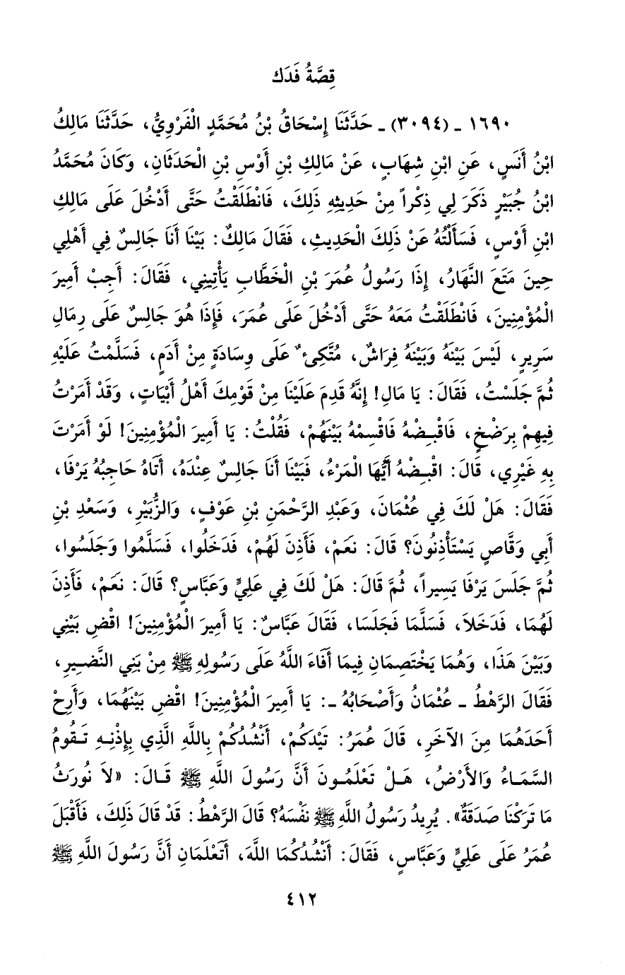 1690 - (3094) - حَدَّثَنَا إِسْحَاقُ بْنُ مُحَمَّدٍ الْفَرْوِيُّ، حَدَّثَنَا مَالِكُ ابْنُ أَنَسٍ، عَنِ ابْنِ شِهَابٍ، عَنْ مَالِكِ بْنِ أَوْسِ بْنِ الْحَدَثَانِ، وَكَانَ مُحَمَّدُ ابْنُ جُبَيْرٍ ذَكَرَ لِي ذِكْراً مِنْ حَدِيثِهِ ذَلِكَ، فَانْطَلَقْتُ حَتَّى أَدْخُلَ عَلَى مَالِكِ ابْنِ أَوْسٍ، فَسَأَلْتُهُ عَنْ ذَلِكَ الْحَدِيثِ، فَقَالَ مَالِكٌ: بَيْنَا أَناَ جَالِسٌ فِي أَهْلِي حِينَ مَتَعَ النَّهَارُ، إِذَا رَسُولُ عُمَرَ بْنِ الْخَظَّابِ يَأْتِينِي، فَقَالَ: أَجِبْ أَمِيرَ الْمُؤْمِنِينَ، فَانْطَلَقْتُ مَعَهُ حَتَّى أَدْخُلَ عَلَى عُمَرَ، فَإِذَا هُوَ جَالِسٌ عَلَى رِمَالِ سَرِيرٍ، لَيْسَ بَيْنَهُ وَبَيْنَهُ فِرَاشٌ، مُتَكِئٌ عَلَى وِسَادَةٍ مِنْ أَدَمٍ، فَسَلَّمْتُ عَلَيْهِ ثُمَّ جَلَسْتُ، فَقَالَ: يَا مَالِ! إِنَّهُ قَدِمَ عَلَيْنَا مِنْ قَوْمِكَ أَهْلُ أَبْيَاتٍ، وَقَدْ أَمَرْتُ فِيهِمْ بِرَضْخٍ، فَاقْبِضْهُ فَاقْسِمْهُ بَيْنَهُمْ، فَقُلْتُ: يَا أَمِيرَ الْمُؤْمِنِينَ! لَوْ أَمَرْتَ بِهِ غَيْرِي، قَالَ: اقْبِضْهُ أَيُّهَا الْمَرْءُ، فَبَيْنَا أَناَ جَالِسٌ عِنْدَهُ، أَتَاهُ حَاجِبُهُ يَرْفَا، فَقَالَ: هَلْ لَكَ فِي عُثْمَانَ، وَعَبْدِ الرَّحْمَنِ بْنِ عَوْفٍ، وَالزُّبَيْرِ، وَسَعْدِ بْنِ أَبِي وَقَّاصٍ يَسْتَأْذِنُونَ؟ قَالَ: نَعَمْ، فَأَذِنَ لَهُمْ، فَدَخَلُوا، فَسَلَّمُوا وَجَلَسُوا، ثُمَّ جَلَسَ يَرْفَا يَسِيراً، ثُمَّ قَالَ: هَلْ لَكَ فِي عَلِيِّ وَعَبَّاسٍ؟ قَالَ: نَعَمْ، فَأَذِنَ لَهُمَا، فَدَخَلاَ، فَسَلَّمَا فَجَلَسَا، فَقَالَ عَبَّاسٌ: يَا أَمِيرَ الْمُؤْمِنِينَ! اقْضِ بَيْنِي وَبَيْنَ هَذَا، وَهُمَا يَخْتَصِمَانِ فِيمَا أَفَاءَ اللهُ عَلَى رَسُولِهِ - صلى الله عليه وسلم - مِنْ بَنِي النَّضِيرِ، فَقَالَ الرَّهْطُ -عُثْمَانُ وَأَصْحَاُبهُ-: يَا أَمِيرَ الْمُؤْمِنِينَ! اقْضِ بَيْنَهُمَا، وَأَرِحْ أَحَدَهُمَا مِنَ الآخَرِ، قَالَ عُمَرُ: تَيْدَكُمْ، أَنْشُدُكُمْ بِاللهِ الَّذِي بِإِذْنِهِ تَقُومُ السَّمَاءُ وَالأَرْضُ، هَلْ تَعْلَمُونَ أَنَّ رَسُولَ اللهِ - صلى الله عليه وسلم - قَالَ: "لاَ نُورَثُ مَا تَرَكْنَا صَدَقَة". يُرِيدُ رَسُولُ اللهِ - صلى الله عليه وسلم - نَفْسَهُ؟ قَالَ الرَّهْطُ: قَدْ قَالَ ذَلِكَ، فَأَقْبَلَ عُمَرُ عَلَى عَلِيٍّ وَعَبَّاسٍ، فَقَالَ: أَنْشُدُكُمَا اللهَ، أَتَعْلَمَانِ أَنَّ رَسُولَ اللهِ - صلى الله عليه وسلم -