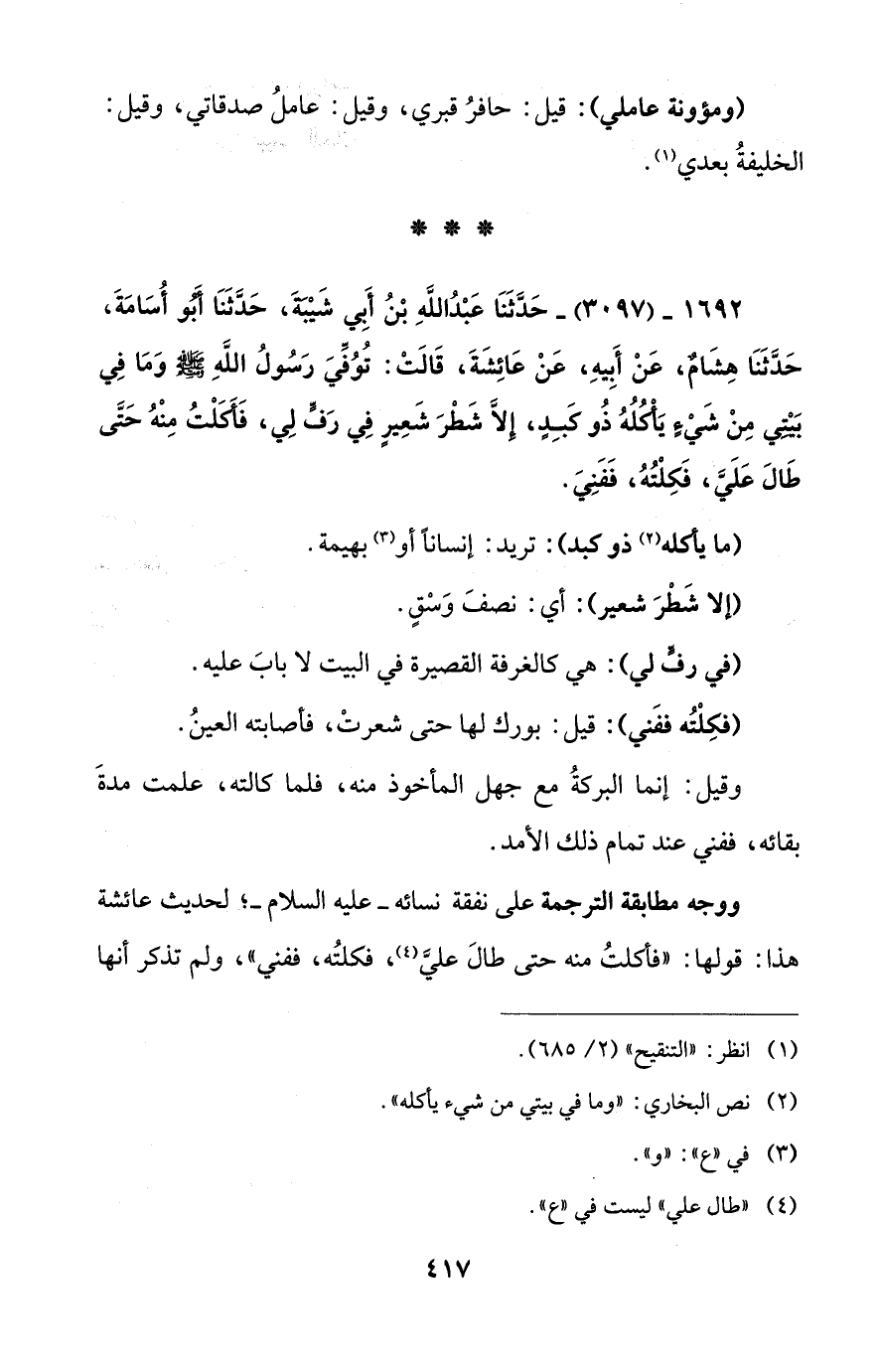 1692 - (3097) - حَدَّثَنَا عَبْدُ اللهِ بْنُ أَبِي شَيْبَةَ، حَدَّثَنَا أَبُو أُسَامَةَ، حَدَّثَنَا هِشَامٌ، عَنْ أَبِيهِ، عَنْ عَائِشَةَ، قَالَتْ: تُوُفِّيَ رَسُولُ اللهِ - صلى الله عليه وسلم - وَمَا فِي بَيْتِي مِنْ شَيْءٍ يَأْكُلُهُ ذُو كَبِدٍ، إِلاَّ شَطْرَ شَعِيرٍ فِي رَفٍّ لِي، فَأَكَلْتُ مِنْهُ حَتَّى طَالَ عَلَي، فَكِلْتُهُ، فَفَنِيَ.