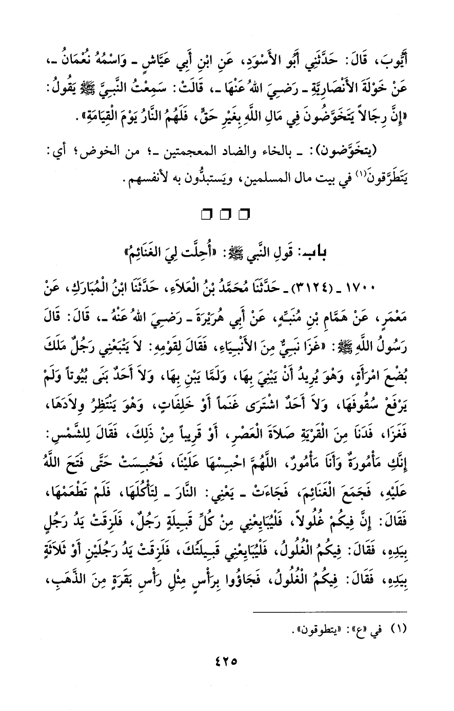 1700 - (3124) - حَدَّثَنَا مُحَمَّدُ بْنُ الْعَلاَءِ، حَدَّثَنَا ابْنُ الْمُبَارَكِ، عَنْ مَعْمَرٍ، عَنْ هَمَّامِ بْنِ مُنَبِّهٍ، عَنْ أَبِي هُرَيْرَةَ -رَضِيَ اللهُ عَنْهُ-، قَالَ: قَالَ رَسُولُ اللهِ - صلى الله عليه وسلم -: "غَزَا نَبِيٌّ مِنَ الأَنْبِيَاءِ، فَقَالَ لِقَوْمِهِ: لاَ يَتْبَعْنِي رَجُلٌ مَلَكَ بُضْعَ امْرَأَةٍ، وَهْوَ يُرِيدُ أَنْ يَبْنِيَ بِهَا، وَلَمَّا يَبْنِ بِهَا، وَلاَ أَحَدٌ بَنَى بُيُوتاً وَلَمْ يَرْفَعْ سُقُوفَهَا، وَلاَ أَحَدٌ اشْتَرَى غَنَماً أَوْ خَلِفَاتٍ، وَهْوَ يَنْتَظِرُ وِلاَدَهَا، فَغَزَا، فَدَناَ مِنَ الْقَرْيَةِ صَلاَةَ الْعَصْرِ، أَوْ قَرِيباً مِنْ ذَلِكَ، فَقَالَ لِلشَّمْسِ: إِنَّكِ مَأْمُورَةٌ وَأَناَ مَأْمُورٌ، اللَّهُمَّ احْبِسْهَا عَلَيْنَا، فَحُبِسَتْ حَتَّى فَتَحَ اللهُ عَلَيْهِ، فَجَمَعَ الْغَنَائِمَ، فَجَاءَتْ -يَعْنِي: النَّارَ- لِتَأْكُلَهَا، فَلَمْ تَطْعَمْهَا، فَقَالَ: إِنَّ فِيكُمْ غُلُولاً، فَلْيُبَايِعْنِي مِنْ كُلِّ قَبِيلَةٍ رَجُلٌ، فَلَزِقَتْ يَدُ رَجُلٍ بِيَدِهِ، فَقَالَ: فِيكُمُ الْغُلُولُ، فَلْيُبَايِعْنِي قَبِيلَتُكَ، فَلَزِقَتْ يَدُ رَجُلَيْنِ أَوْ ثَلاَثَةٍ بِيَدِهِ، فَقَالَ: فِيكُمُ الْغُلُولُ، فَجَاؤُوا بِرَأْسٍ مِثْلِ رَأْسِ بقَرَةٍ مِنَ الذَّهَبِ،