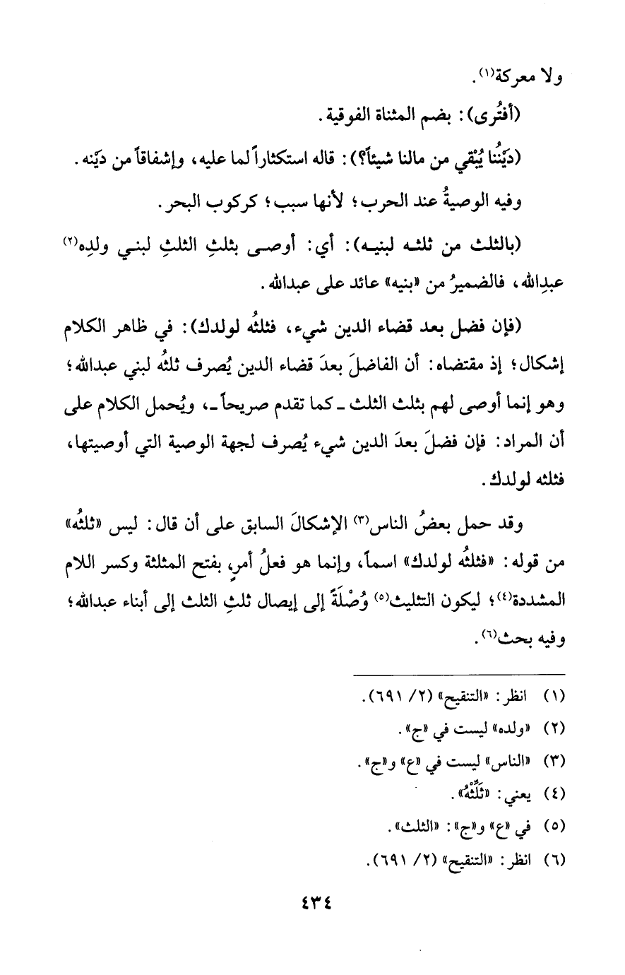 وقد حمل بعضُ الناس (¬3) الإشكالَ السابق على أن قال: ليس "ثلثُه" من قوله: "فثلثُه لولدك" اسماً، وإنما هو فعلُ أمرٍ، بفتح المثلثة وكسر اللام المشددة (¬4)؛ ليكون التثليث (¬5) وُصْلَةً إلى إيصال ثلثِ الثلث إلى أبناء عبد الله؛ وفيه بحث (¬6).