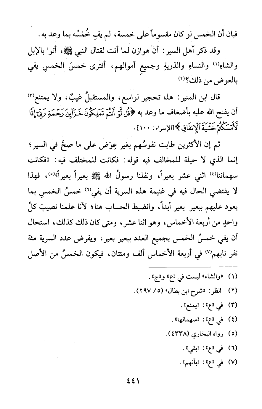 ثم إن الأكثرين طابت نفوسُهم بغير عِوَض على ما صحَّ في السير؛ إنما الذي لا حيلة للمخالف فيه قوله: فكانت للمختلف فيه: "فكانت سهماننا (¬4) اثني عشر بعيراً، ونفلنا رسولُ الله - صلى الله عليه وسلم - بعيراً بعيراً" (¬5)، فهذا لا يقتضي الحال فيه في غنيمة هذه السرية أن يفي (¬6) خمسُ الخمسِ بما يعود عليهم ببعير بعير أبداً، وانضبط الحساب هنا؛ لأنا علمنا نصيبَ كلِّ واحدٍ من أربعة الأخماس، وهو اثنا عشر، ومتى كان ذلك كذلك، استحال أن يفي خمسُ الخمس بجميع العدد ببعير بعير، ويفرض عدد السرية مئة نفر نابهم (¬7) في أربعة الأخماس ألف ومئتان، فيكون الخمسُ من الأصل