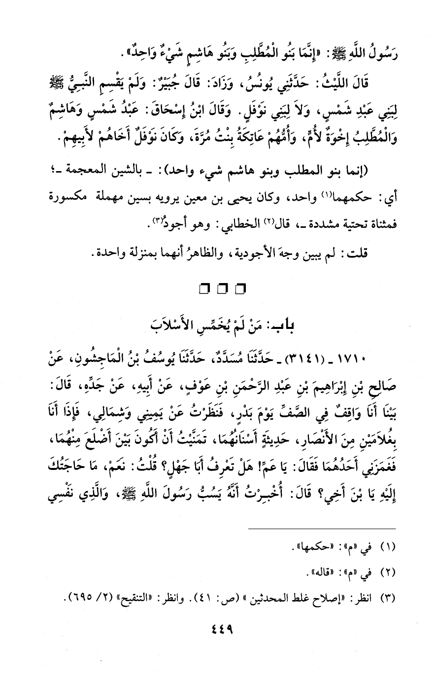 رَسُولُ اللهِ - صلى الله عليه وسلم -: "إِنَّمَا بَنُو الْمُطَّلِبِ وَبَنُو هَاشِمٍ شَيْءٌ وَاحِدٌ".