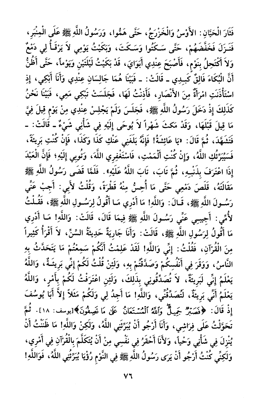 فَثَارَ الْحَيَّانِ: الأَوْسُ وَالْخَزْرَجُ، حَتَّى هَمُّوا، وَرَسُولُ اللهِ - صلى الله عليه وسلم - عَلَى الْمِنْبَرِ، فَنَزَلَ فَخَفَّضَهُمْ، حَتَّى سَكَتُوا وَسَكَتَ، وَبَكَيْتُ يَوْمِي لاَ يَرْقَأُ لِي دَمْعٌ وَلاَ أَكْتَحِلُ بِنَوْمٍ، فَأَصْبَحَ عِنْدِي أَبَوَايَ، قَدْ بَكَيْتُ لَيْلَتَيْنِ وَيَوْماً، حَتَّى أَظُنُّ أَنَّ الْبُكَاءَ فَالِقٌ كَبِدِي -قَالَتْ:- فَبَيْنَا هُمَا جَالِسَانِ عِنْدِي وَأَنَا أَبْكِي، إِذِ اسْتَأْذَنَتِ امْرَأةٌ مِنَ الأَنْصَارِ، فَأَذِنْتُ لَهَا، فَجَلَسَتْ تَبْكِي مَعِي، فَبَيْنَا نَحْنُ كَذَلِكَ إِذْ دَخَلَ رَسُولُ اللهِ - صلى الله عليه وسلم -، فَجَلَسَ وَلَمْ يَجْلِسْ عِنْدِي مِنْ يَوْمِ قِيلَ فِيَّ مَا قِيلَ قَبْلَهَا، وَقَدْ مَكثَ شَهْراً لاَ يُوحَى إِلَيْهِ فِي شَأْنِي شَيْءٌ -قَالَتْ:- فَتَشَهَّدَ، ثُمَّ قَالَ: "يَا عَائِشَةُ! فَإِنَّهُ بَلَغَنِي عَنْكِ كَذَا وَكَذَا، فَإِنْ كُنْتِ بَرِيئَةً، فَسَيُبَرِّئُكِ الله، وَإِنْ كُنْتِ أَلْمَمْتِ، فَاسْتَغْفِرِي اللهَ، وَتُوبِي إِلَيْهِ؛ فَإِنَّ الْعَبْدَ إِذَا اعْتَرَفَ بِذَنْبِهِ، ثُمَّ تَابَ، تَابَ الله عَلَيْهِ". فَلَمَّا قَضَى رَسُولُ اللهِ - صلى الله عليه وسلم - مَقَالَتَهُ، قَلَصَ دَمْعِي حَتَّى مَا أُحِسُّ مِنْهُ قَطْرَةً، وَقُلْتُ لأَبِي: أَجِبْ عَنِّي رَسُولَ اللهِ - صلى الله عليه وسلم -، قَالَ: وَاللهِ! مَا أَدْرِي مَا أَقُولُ لِرَسُولِ اللهِ - صلى الله عليه وسلم -، فَقُلْتُ لأُمِّي: أَجِيبِي عَنِّي رَسُولَ اللهِ - صلى الله عليه وسلم - فِيمَا قَالَ، قَالَتْ: وَاللهِ! مَا أَدْرِي مَا أقولُ لِرَسُولِ اللهِ - صلى الله عليه وسلم -، قَالَتْ: وَأَنَا جَارِيَةٌ حَدِيثةُ السِّنِّ، لاَ أَقْرَأُ كَثِيراً مِنَ الْقُرْآنِ، فَقُلْتُ: إِنِّي وَاللهِ! لَقَدْ عَلِمْتُ أَنَّكُمْ سَمِعْتُمْ مَا يَتَحَدَّثُ بهِ النَّاسُ، وَوَقَرَ فِي أَنْفُسِكُمْ وَصَدَّقْتُم بِهِ، وَلَئِنْ قُلْتُ لَكُمْ إِنِّي بَرِيئَةٌ، وَاللهُ يَعْلَمُ إِنِّي لَبَرِيئَةٌ، لاَ تُصَدِّقُونِي بذَلِكَ، وَلَئِنِ اعْتَرَفْتُ لَكُمْ بِأَمْرٍ، وَاللهُ يَعْلَمُ أَنِّي بَرِيئَةٌ، لَتُصَدِّقُنِّي، وَاللهِ! مَا أَجِدُ لِي وَلَكُمْ مَثَلًا إِلَّا أَبَا يُوسُفُ إِذْ قَالَ: {فَصَبْرٌ جَمِيلٌ وَاللَّهُ الْمُسْتَعَانُ عَلَى مَا تَصِفُونَ} [يوسف: 18]. ثُمَّ تَحَوَّلْتُ عَلَى فِرَاشِي، وَأَنَا أَرْجُو أَنْ يُبَرِّئَنِي اللهُ، وَلَكِنْ وَاللهِ! مَا ظَنَنْتُ أَنْ يُنْزِلَ فِي شَأْنِي وَحْياً، وَلأَنَا أَحْقَرُ فِي نَفْسِي مِنْ أَنْ يُتَكَلَّمَ بِالْقُرْآنِ فِي أَمْرِي، وَلَكِنِّي كُنْتُ أَرْجُو أَنْ يَرَى رَسُولُ اللهِ - صلى الله عليه وسلم - فِي النَّوْمِ رُؤْيَا يُبَرِّئُنِي اللهُ، فَوَاللهِ!