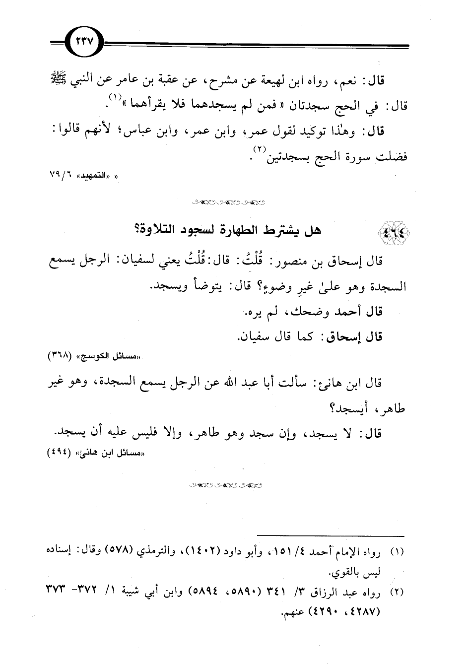 قال إسحاق بن منصور: قُلْتُ: قال: قُلْتُ يعني لسفيان: الرجل يسمع السجدة وهو على غيرِ وضوءٍ؟ قال: يتوضأ ويسجد.