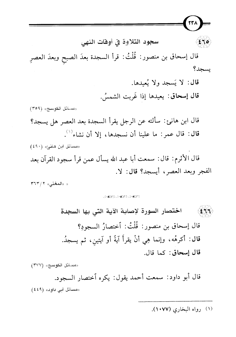 قال إسحاق بن منصور: قُلْتُ: قرأ السجدة بعدَ الصبحِ وبعدَ العصرِ يسجد؟