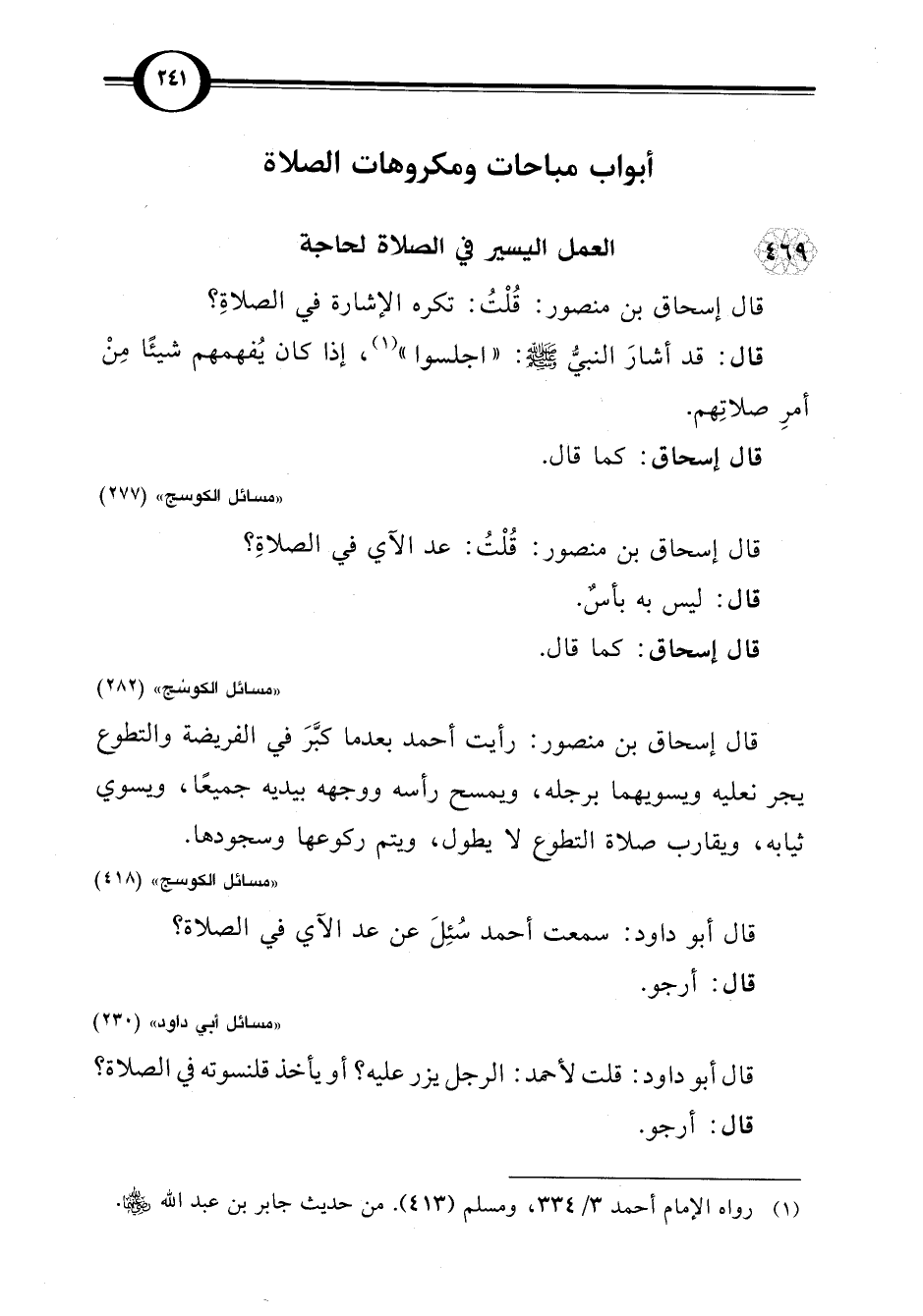 قال إسحاق بن منصور: قُلْتُ: تكره الإشارة في الصلاةِ؟