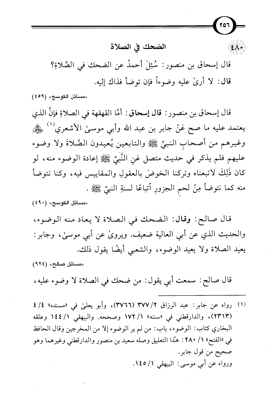 قال إسحاق بن منصور: قال إسحاق: أمَّا القهقهة في الصلاةِ فإنَّ الذي يعتمد عليه ما صح عَنْ جابر بن عبد اللَّه وأبي موسى الأشعري (¬1) -رضي اللَّه عنهم- وغيرهم من أصحابِ النبيِّ -صلى اللَّه عليه وسلم- والتابعين يُعيدون الصَّلاةَ ولا وضوء عليهم فلم يذكر في حديث متصل عَنِ النَّبيِّ -صلى اللَّه عليه وسلم- إعادة الوضوء منه، لو كان ذَلِكَ لاتبعناه وتركنا الخوضَ بالعقولِ والمقاييس فيه، وكنا نتوضأ منه كما نتوضأ مِنْ لحمِ الجزورِ اتباعًا لسنةِ النبيِّ -صلى اللَّه عليه وسلم-.