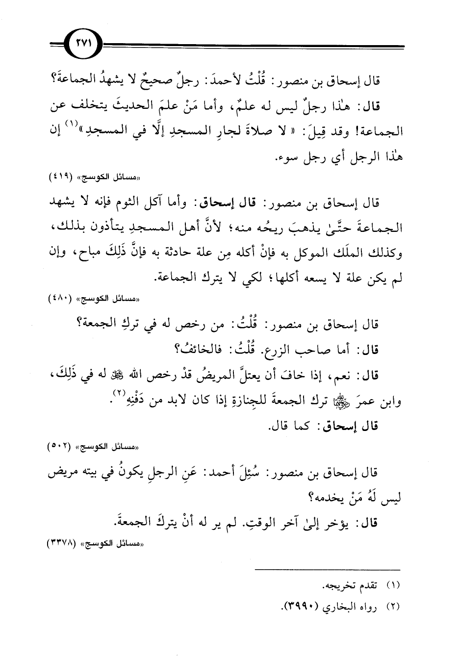 قال إسحاق بن منصور: قُلْتُ لأحمدَ: رجلٌ صحيحٌ لا يشهدُ الجماعةَ؟
