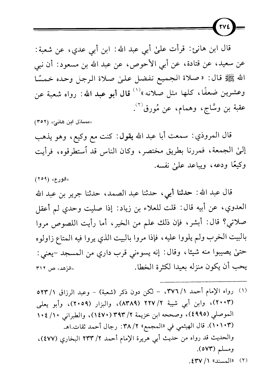 قال ابن هانئ: قرأت على أبي عبد اللَّه: ابن أبي عدي، عن شعبة: عن سعيد، عن قتادة، عن أبي الأحوص، عن عبد اللَّه بن مسعود: أن نبي اللَّه -صلى اللَّه عليه وسلم- قال: " صلاة الجميع تفضل على صلاة الرجل وحده خمسًا وعشرين ضعفًا، كلها مثل صلاته" (¬1) قال أبو عبد اللَّه: رواه شعبة عن عقبة بن وسَّاج، وهمام، عن مُورق (¬2).