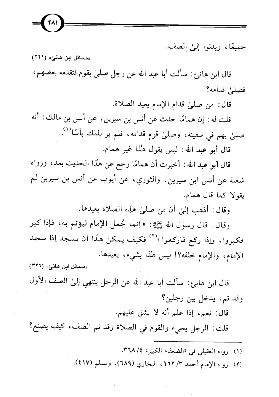 قال ابن هانئ: سألت أبا عبد اللَّه عن رجل صلى بقوم فتقدمه بعضهم، فصلى قدامه؟