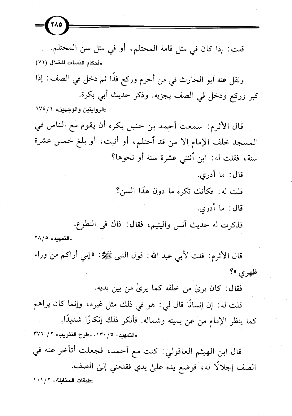 قال الأثرم: سمعت أحمد بن حنبل يكره أن يقوم مع الناس في المسجد خلف الإمام إلا من قد احتلم، أو أنبت، أو بلغ خمس عشرة سنة، فقلت له: ابن اثنتي عشرة سنة أو نحوها؟